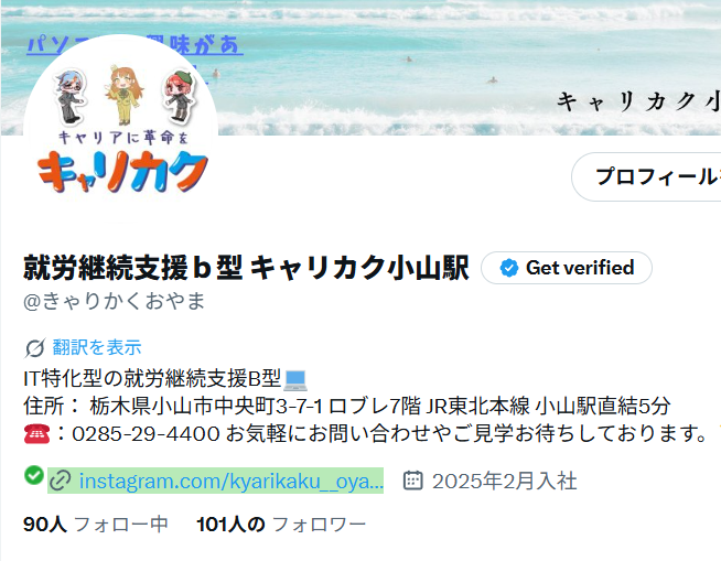 こんにちはキャリカク小山駅です♪ キャリカク小山駅のXのフォロワー様が100人を超えました!!皆様フォローの方ありがとうございます🥺🙏🏻 これからもキャリカク小山駅をよろしくお願いいたします! #キャリカク #福祉 #小山市 #就労支援 #就労継続支援b型 #フォロワーさん pic.x.com/ZhvZYan321