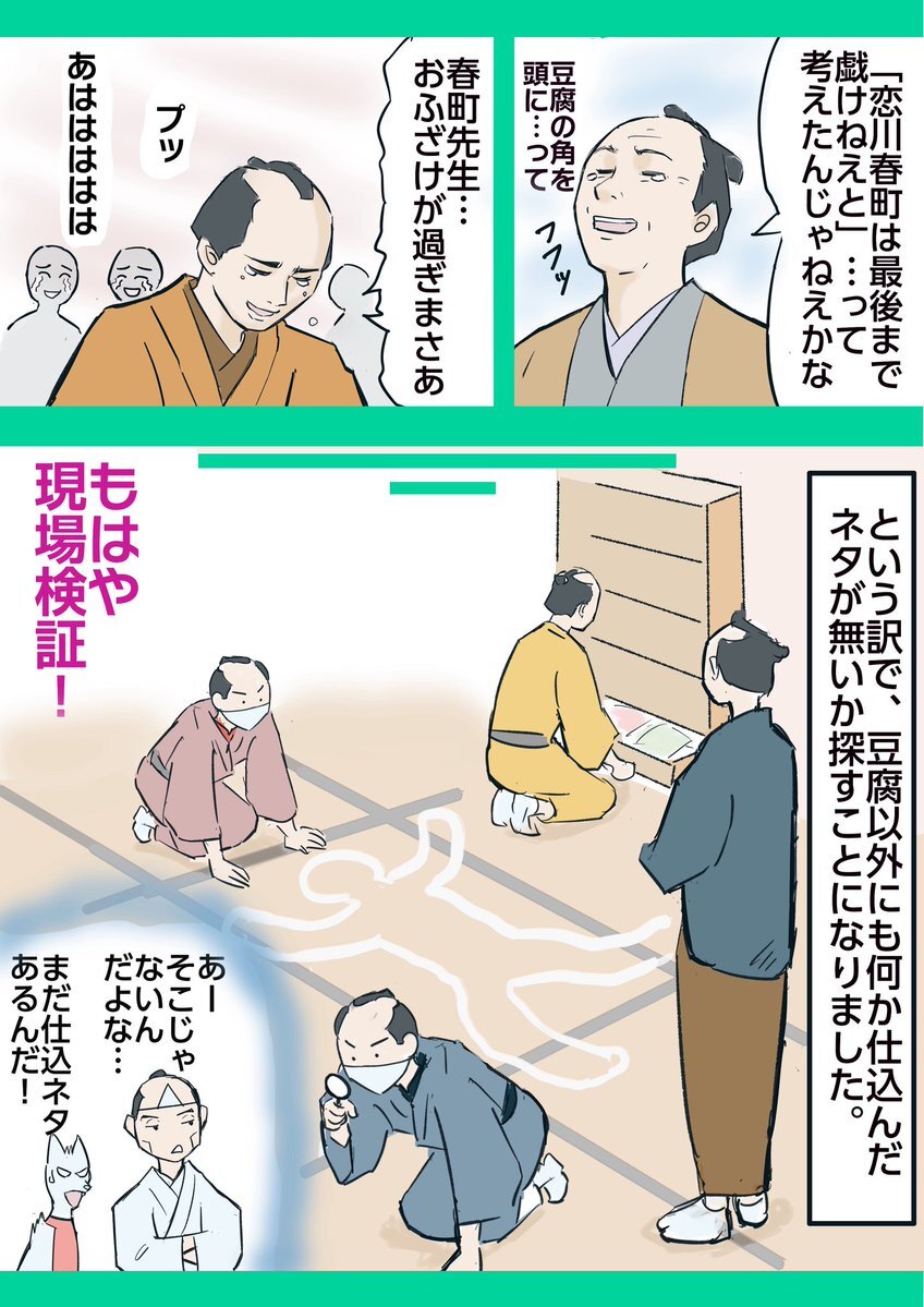 #大河べらぼう 第36話「鸚鵡(おうむ)のけりは鴨(かも)」より 切腹した恋川春町の頭に豆腐がついていることに気づいた蔦重。春町が「豆腐の角に頭をぶつけて死んだ」の再現を思いついたのではないかと戯作者たちは考えました。 #べらぼう絵 #横浜流星 #尾美としのり #岡山天音 #綾瀬はるか pic.x.com/mxq8FwEiGJ