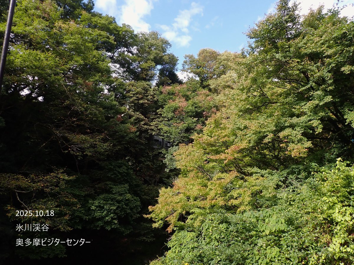 気温15.4度。曇り空の #山のふるさと村 です。 #紅葉 は、同じ場所や木でも緑色や黄色に赤色とたくさんあります。 自分だけの紅葉を、カメラで切り取ってみませんか。 #ビジターセンターに聞いてみよう #奥多摩 pic.x.com/uiqSne7nGx