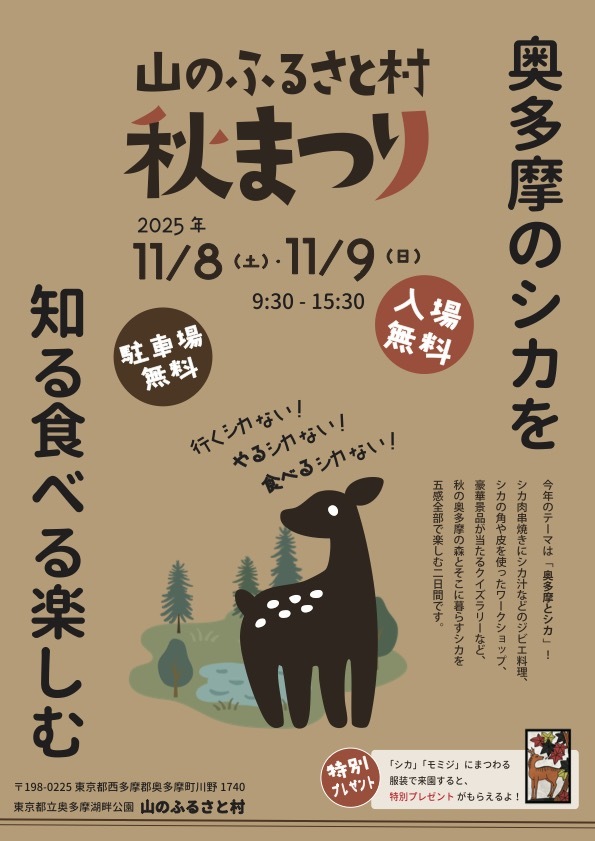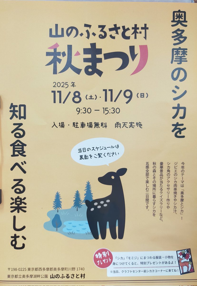 #奥多摩 周辺を紅葉が彩る11月。 そんな秋の #山のふるさと村 では 今年も「山のふるさと村秋まつり」を開催します! 今年の秋まつりのキーワードは「奥多摩とシカ」! 皆様のご来場をお待ちしています! yamafuru.blogspot.com/2025/09/118119… #ビジターセンターに聞いてみよう pic.x.com/686Tt0S6Rk x.com/mitakevc/statu…