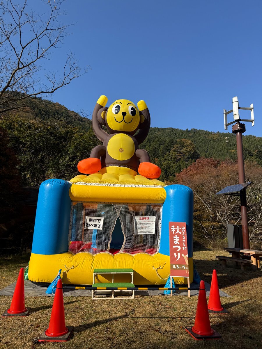 おはようございます。#山のふるさと村秋まつり 、もうすぐ始まります! 今年はシカの串焼きなどのジビエ以外にも、見どころたくさんです。お子さん大喜びの #ふわふわ も登場したよ~!! #奥多摩 #秋まつり #山のふるさと村 pic.x.com/uGmTd3tFto