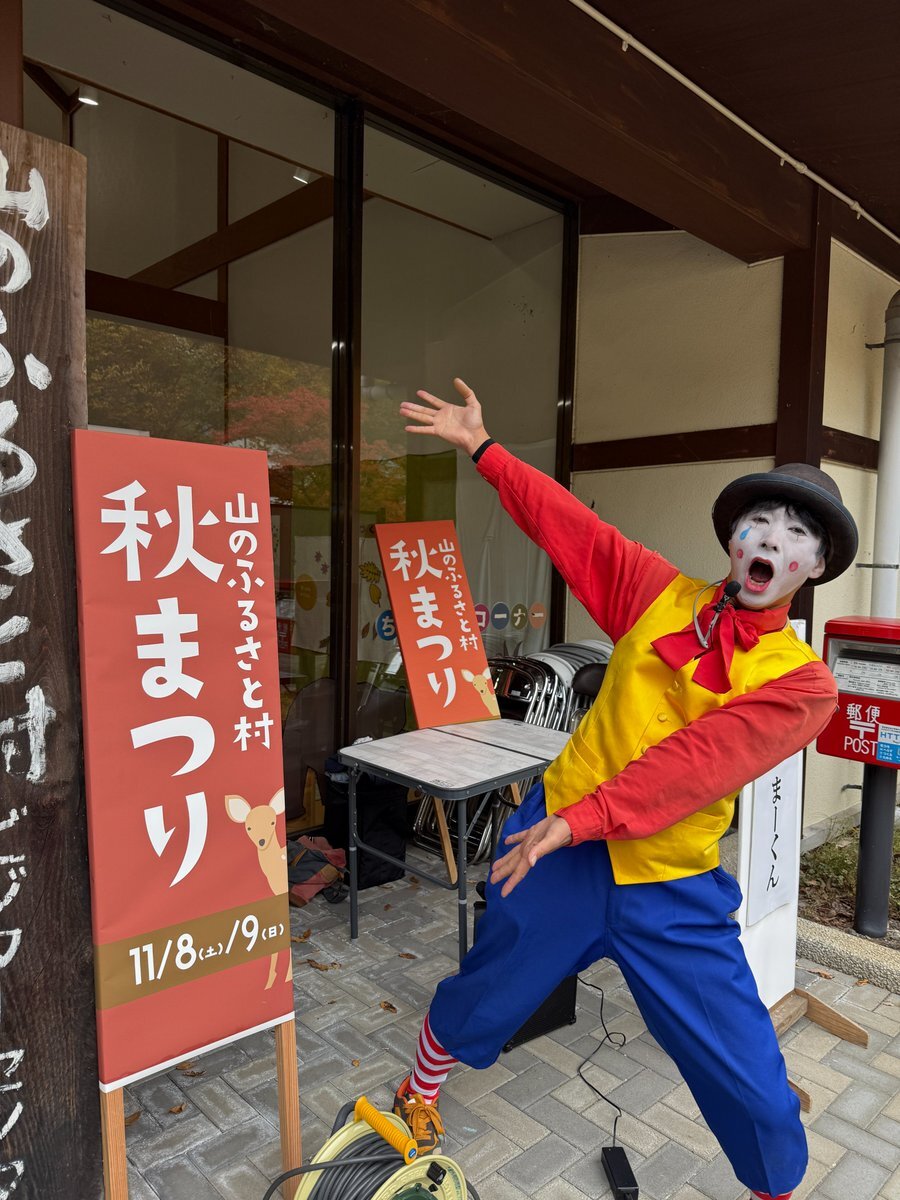 ただいまビジターセンター前にて「ピエロのまーくんショー」が行われています。また11時からは昨日も白熱した「丸太切り競争」が! まだ申込受付中ですよ~! #山のふるさと村秋まつり #奥多摩 pic.x.com/lgstHfM2Wr