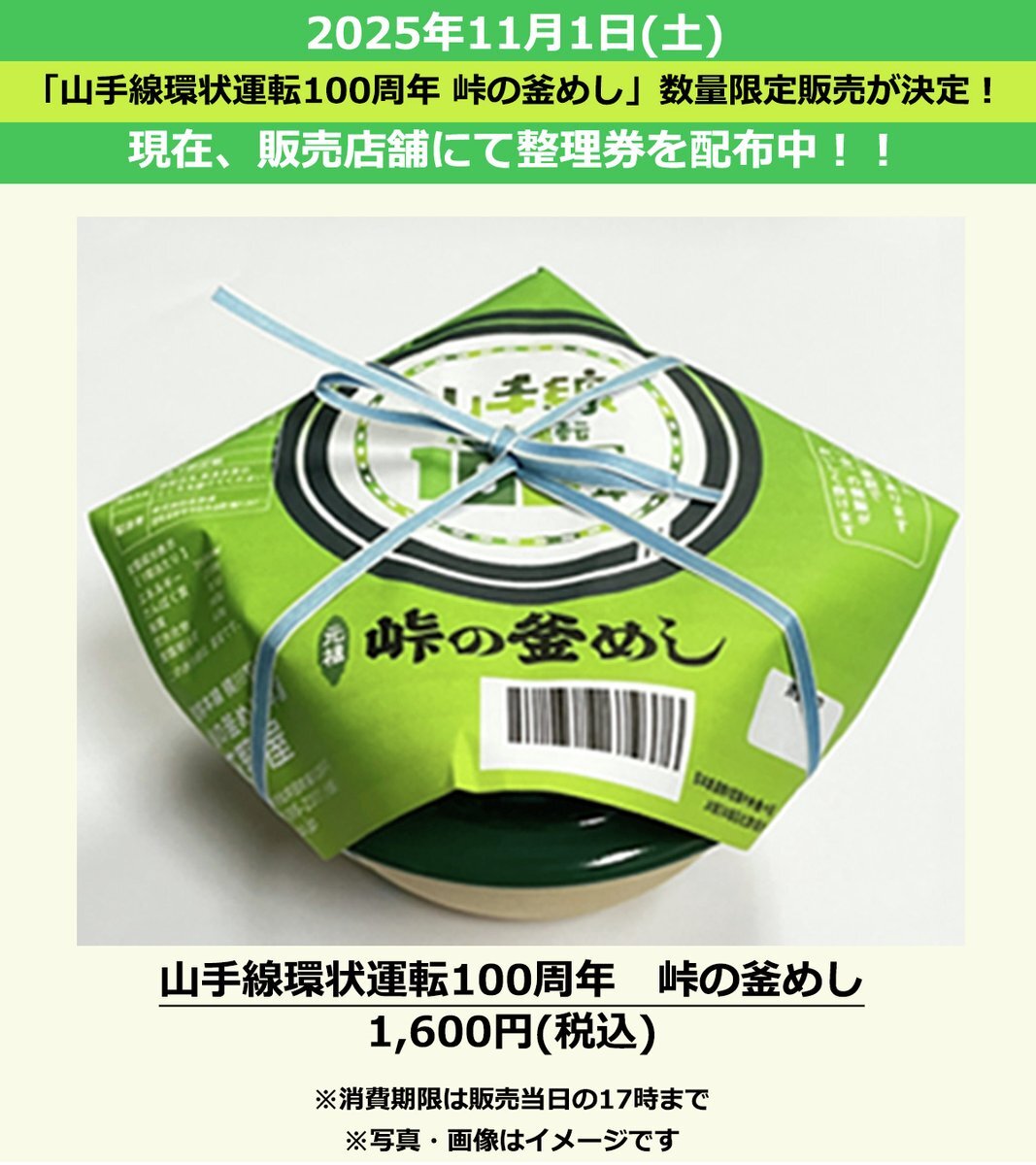 【店舗限定】 11/1(土)、対象店舗にて #山手線環状運転100周年峠の釜めし を数量限定で販売決定🍱! 販売にあたり、現在対象店舗にて整理券を配布中です🔊🎵 100周年を記念した掛け紙と、緑色の釜がセットになった特別仕様の数量限定品✨ 是非お買い求めください🤗 #ニューデイズ #山手線 #峠の釜めし pic.x.com/sJNTfndYES