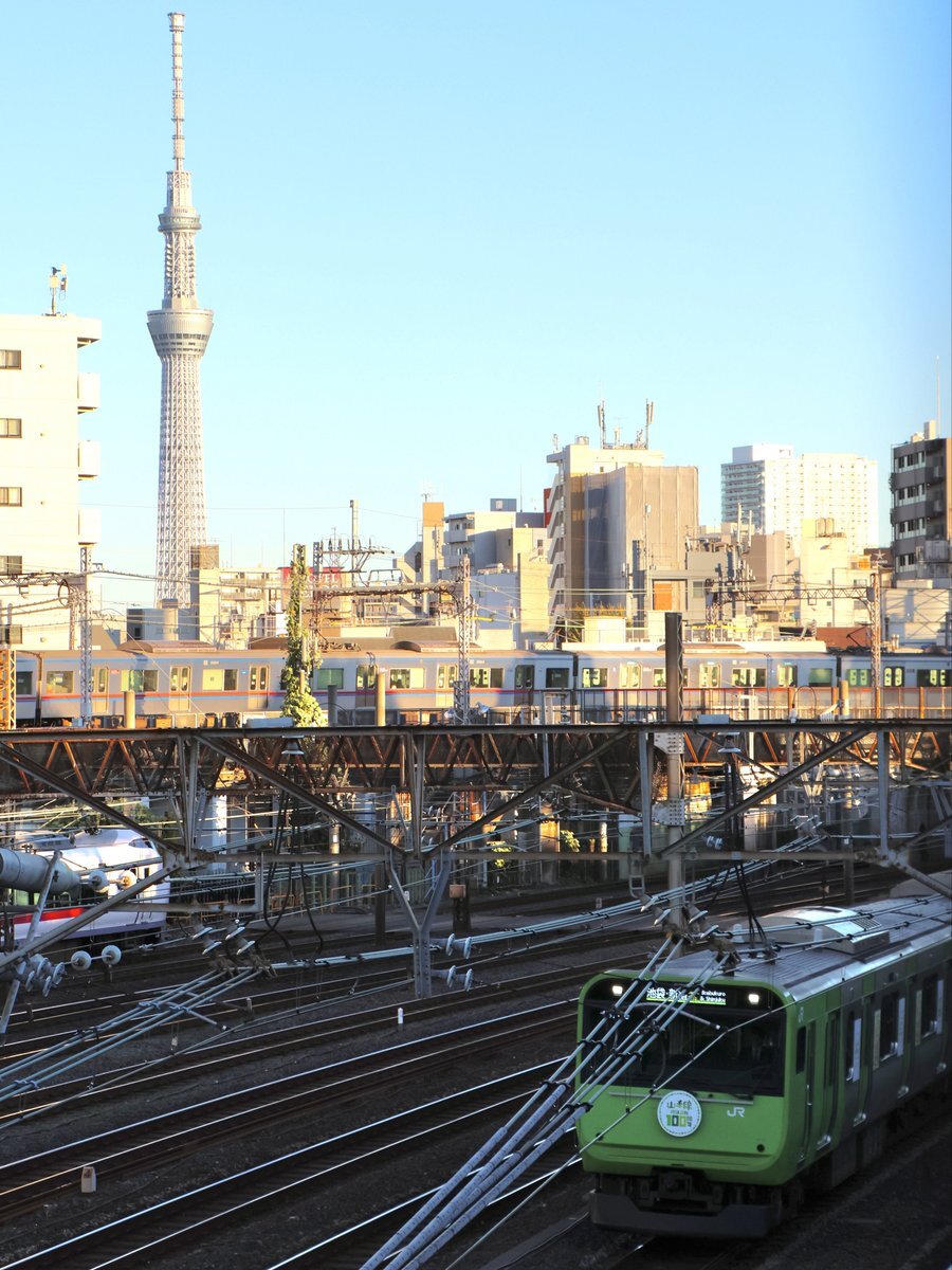 たまたま通りがかった日暮里駅近くの跨線橋、タイミング良く #山手線環状運転100周年記念ラッピング 車 に出会えました🙌🙌🙌103系風と205系風が連続で来てくれました😄 #日暮里跨線橋 #日暮里駅 #山手線103系 #山手線205系 #スカイツリー pic.x.com/lb2FKMUB6F