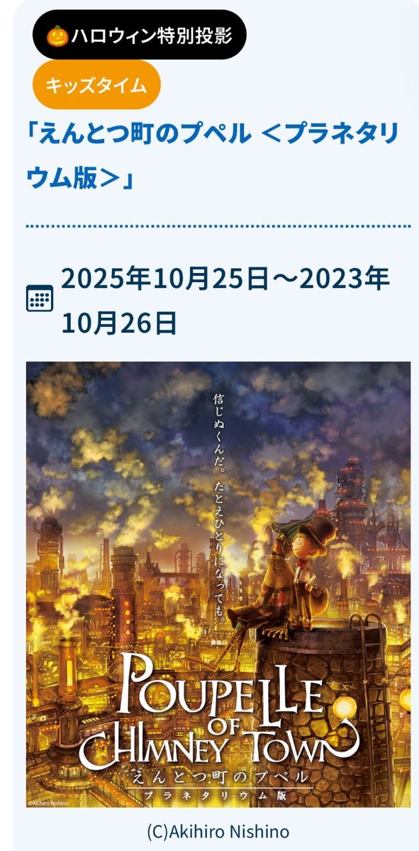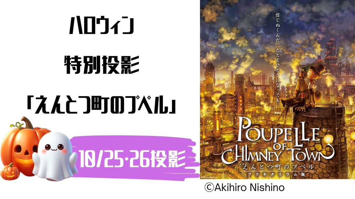 10/25・26 🎃 #プラネタリウム にて、「えんとつ町のプペル」を特別投影いたします! この作品は、絵本『#えんとつ町のプペル』をもとに、プラネタリウム用に特別編集された全天映像作品です。 絵本には登場しない演出も盛り込まれています。「プペル」の世界をご体験ください✨ #山梨県立科学館 #山梨 pic.x.com/B2aXIG0xHE