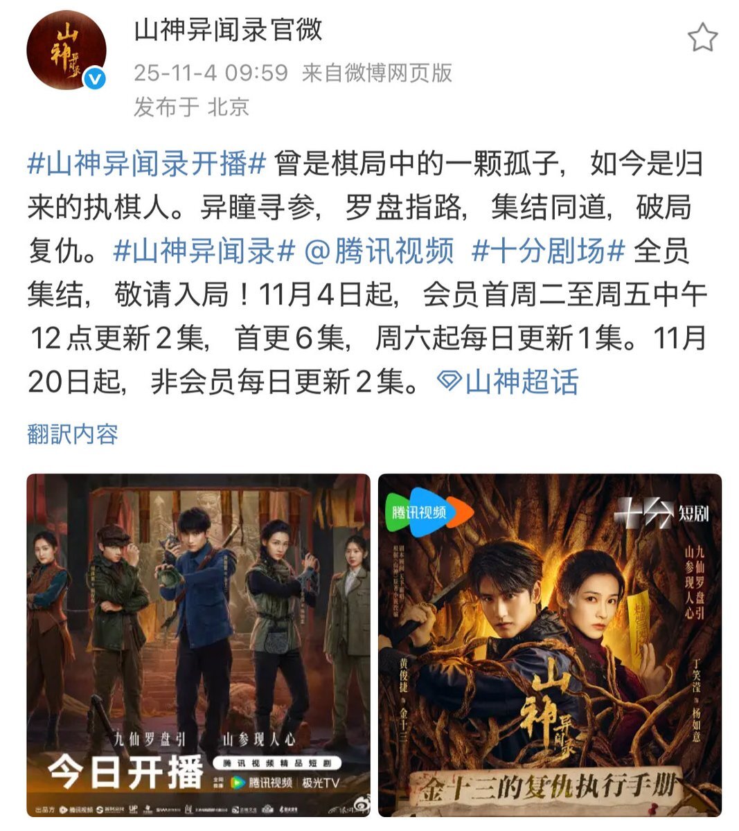 11月14日放送開始!腾讯视频 🐧 ファンタジーありのミステリーありの守護神?物語か…ちょっとグロいシーンもありますね…公開に時間かかりましたね…(こっちが見たい!ミステリーサスペンス好き!) #山神异闻录 #黄俊捷 pic.x.com/ZDBd4p5B6n