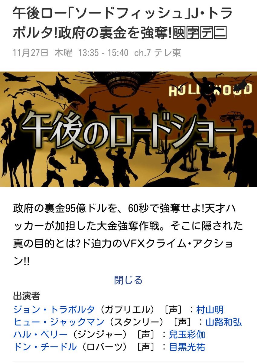 11月27日放送の #午後ロー 『ソードフィッシュ』の吹き替えは【ソフト版】による放送となります。 【声の出演】 #村山明 #山路和弘 #兒玉彩伽 #目黒光祐 pic.x.com/PjpkGZUP6E