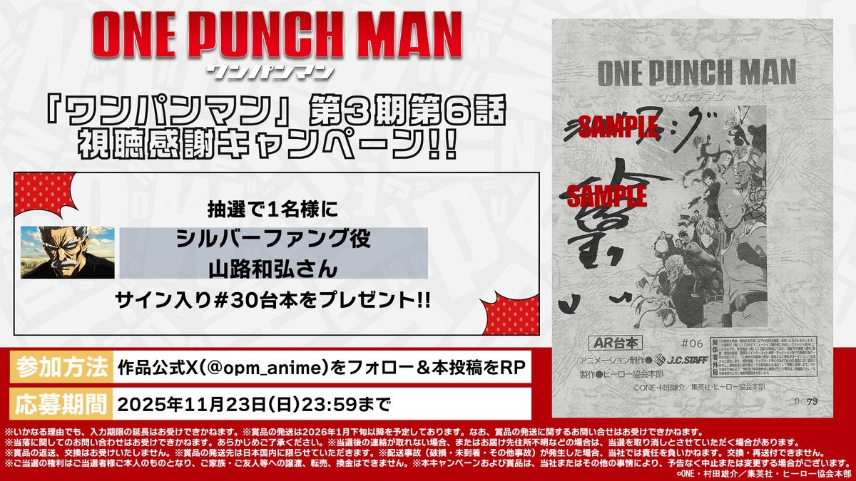 👊第3期視聴感謝キャンペーン👊 #30「不揃いのヒーローたち」 ご視聴ありがとうございました👊 シルバーファング役 #山路和弘 さん のサイン入り台本を【1名様】にプレゼント! 本アカウント(@opm_anime)フォローと 本投稿リポストで応募完了! その他注意事項は画像へ👇 #onepunchman