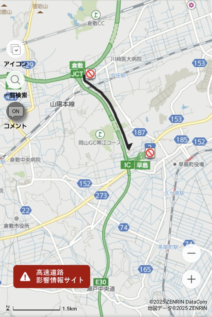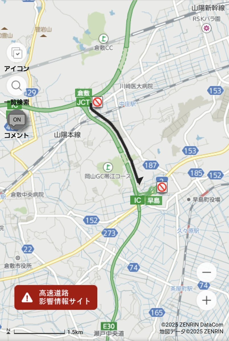 【通行止:解除】 路線区間:E2山陽道(下り線)倉敷JCT~早島IC 解除:5時25分 要因:工事 最新の交通状況▼atis.co.jp/traffic/highwa… #山陽道(倉敷早島支線) ︎#通行止 x.com/highwayinfo0/s…