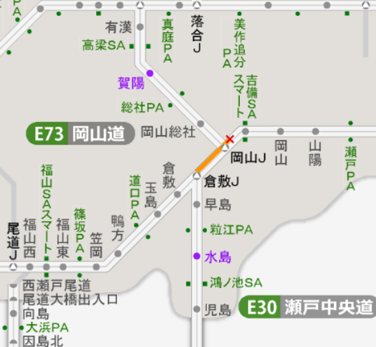 【E︎2山陽道・E︎30瀬戸中央道 夜間工事通行止・ランプ閉鎖】 ⒜.︎E2 #山陽道(倉敷早島支線) 下り線 倉敷JCT~早島IC  1︎1︎/4 ㈫、1︎1︎/5 ㈬ ⒝.︎E30 #瀬戸中央道 上り線 早島IC 出口ランプ  1︎1︎/4 ㈫ ~ 1︎1︎/21︎ ㈮ ※︎土日除く 各日20時から翌6時まで ※︎雨天順延