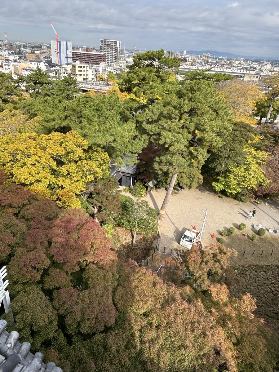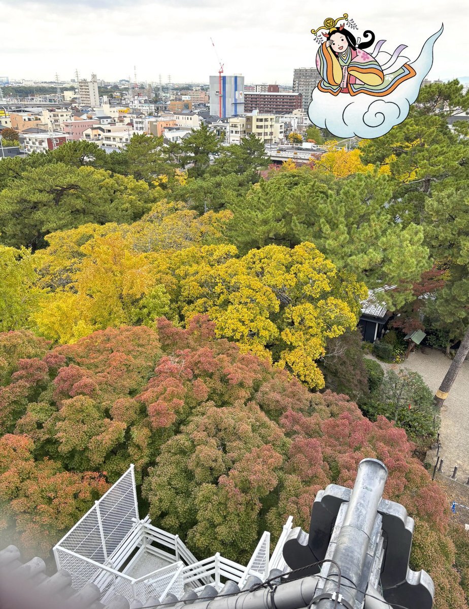 竜神ちゃんじゃ♪ 今朝の #岡崎城天守 5階からの眺めじゃ✨ 葉の色づきが少しずつ濃くなってきておるの。 天守北側の、このもこもこしてるカエデが少しずつ赤〜くなっていくのを見下ろすのが、竜神ちゃんは楽しみなのじゃ😊 pic.x.com/CUuQsVsxsK