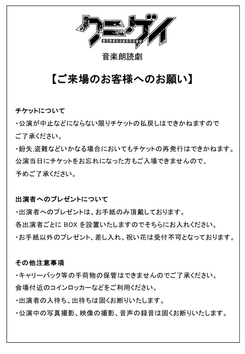 10/11(土)狛江エコルマホール #梶原岳人,#岡本信彦,#高橋広樹,#西山宏太朗 他 ご来場の皆様へのお願いになります。 下記ご確認ください。 kunigei-roudokugeki.com #クニゲイ朗読劇 pic.x.com/oN5nfvADOW