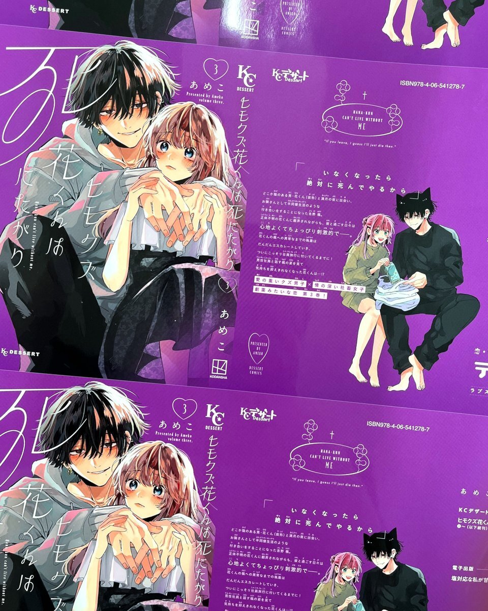 . ⋱ゾクゾク重版出来!⋰ 『ヒモクズ花くんは死にたがり』  ③巻発売まで✨あと4⃣日✨ 🐈‍⬛カバー刷りだし初公開🐈‍⬛ 謎の多い花くんとお隣さんとして、半同棲生活のような付き合いをすることになった楓。 花くんの異常なまでの執着は、だんだんエスカレートして…!? #あめこ