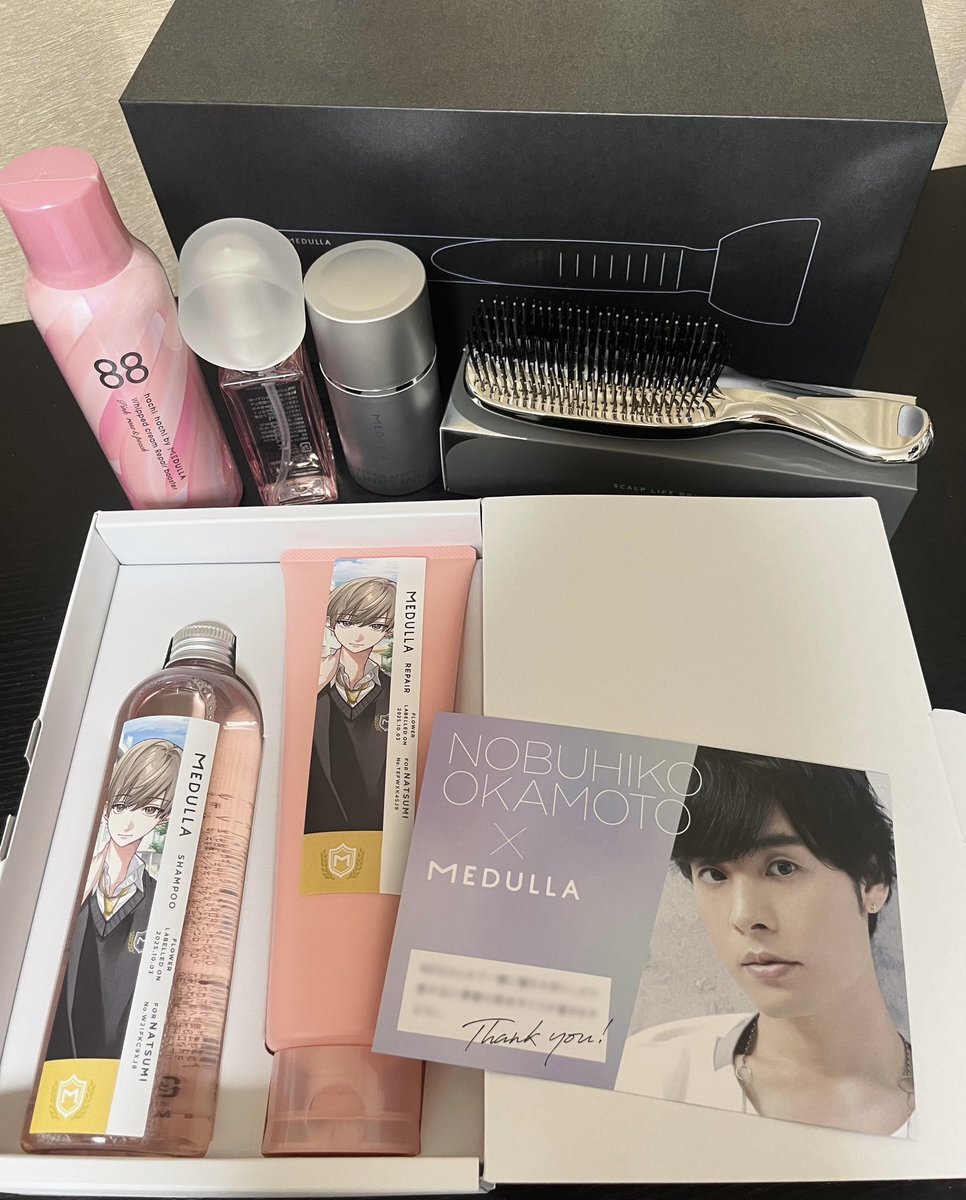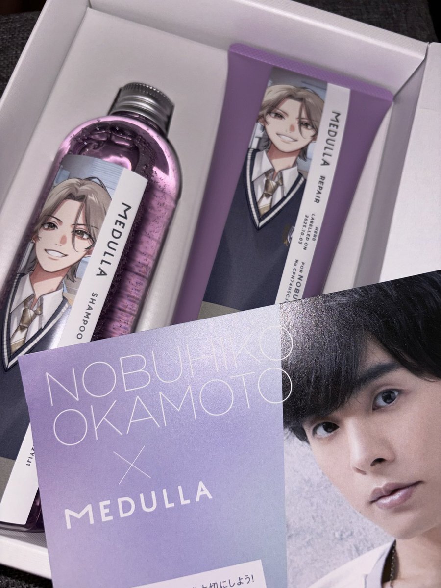 #メデュラ 無事に届きました! キャラは生徒会長!香りはHERB🌿 とってもいい香りで癒される、、、 髪のダメージが気になっていたので今回のコラボとっても嬉しかったです☺️ 毎日使ってとぅるとぅるの髪にします✨ 今後のボイスも楽しみ🤍 #のぶくんとメデュタイム #岡本信彦 さん pic.x.com/yYzmUv1lRA