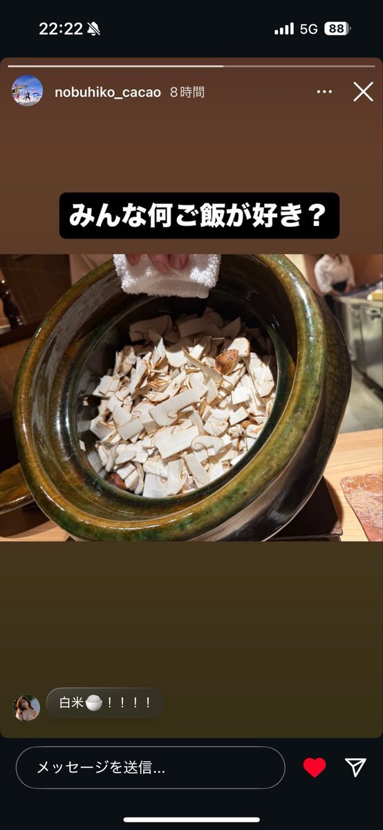 のぶ君最近sns投稿多い😳💕 インスタは見るだけのアカウントしかないからコメント控えるけど。 松茸ご飯というハードル高いの持ってきたww 私はシャケが好きです、、🐟💓笑 #岡本信彦 #インスタグラム pic.x.com/WFYYGz2wsz