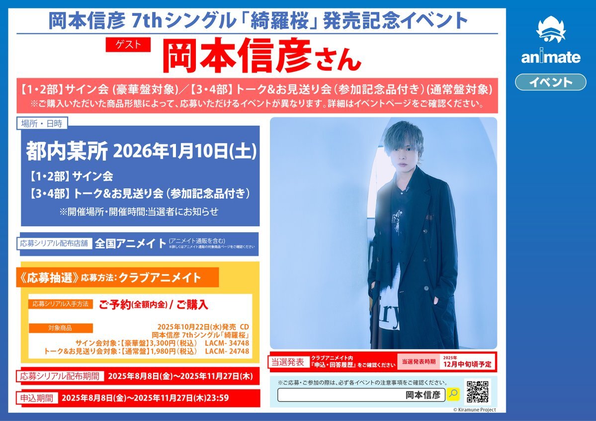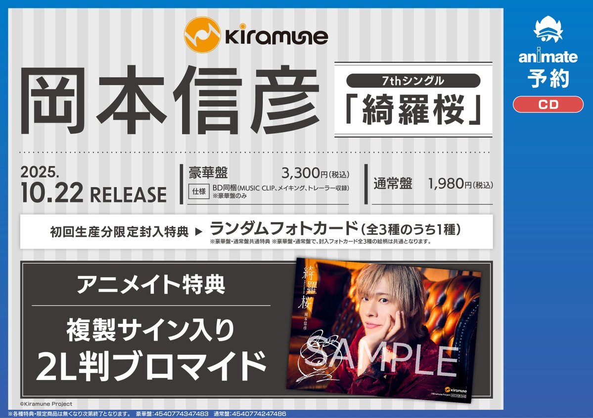 【CD予約情報】 10/22発売『#岡本信彦/7thシングル「綺羅桜」』 ご予約受付中‼ 🎁アニメイト特典 複製サイン入り2L判ブロマイド 発売記念イベント開催🎉 ご予約(全額内金)もしくは、ご購入いただいたお客様に、商品形態に応じた応募シリアルをお渡しいたします。 詳細はPOPをご確認ください👇 pic.x.com/axGAZV66kS