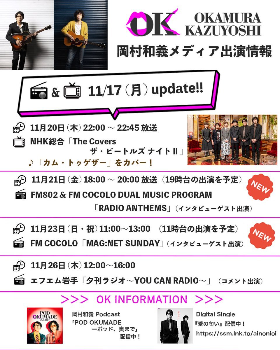#岡村和義(#岡村靖幸×#斉藤和義) 📻ラジオ出演情報更新! 🗓️11/23(日・祝)11:00〜13:00 ※11時台の出演を予定 📻FM COCOLO「MAG:NET SUNDAY」 ゲスト出演! エンタテインメントの現場感を大切に届けるエンタメ現場主義プログラム。 今回は一体どんなお話が飛び出すのか、 どうぞお楽しみに! pic.x.com/nESyY8lKCK