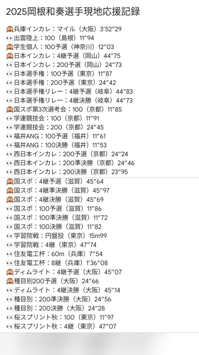 【訂正版】 2025シーズン、甲南大学女子陸上競技部の岡根和奏選手のレースの現地応援記録 ※学連競技会が抜けてました💦 34レース中25レース現地応援(リレー、円盤投含む)、時間にしたら296秒04(リレー、円盤投除く) 来シーズンも応援するで📣 #甲華在心 #甲南大学女子陸上競技部 #岡根和奏 pic.x.com/bzvHwySXLV