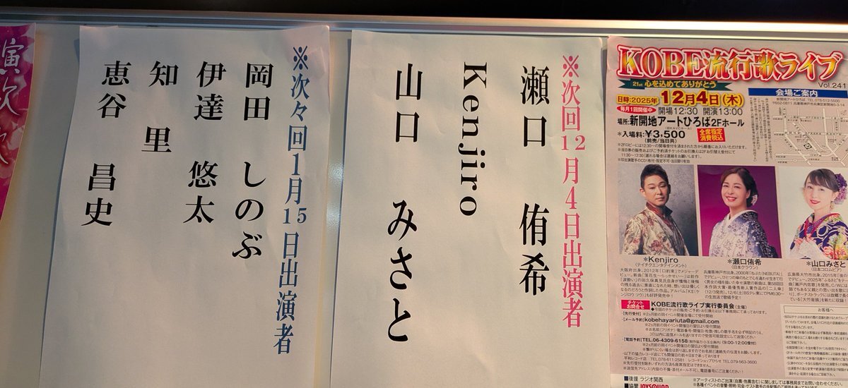#KOBE流行歌ライブ #新開地アートひろば 12月4日(木)13時開演 入場料¥3,500 敬称略 出演者 #瀬口侑希 #kenjiro #山口みさと 1月15日(木) #岡田しのぶ #伊達悠太 #知里 #惠谷昌史 おはようございます 6時37分 11/15(土)神戸 気温8℃ pic.x.com/1O4P2qGYpC