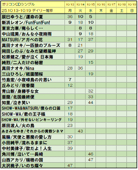 10/15発売週 演歌・歌謡曲系の オリコンCDシングルデイリー一覧。 紅白初出場をかけ全12形態の CDで勝負する #辰巳ゆうと と 連続出場に向け全10形態の #新浜レオン が追込み中。#東京力車 も同様に追撃(全6形態) #中山琉美 #岡田しのぶ #松原健之 は 1形態 で健闘中。こちらもヒット☺️ #おとラボ pic.x.com/nrOvYcMxDb