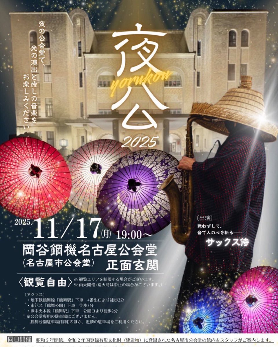 2025.11.17 #岡谷鋼機名古屋公会堂(名古屋市公会堂) 【夜公2025】 #ライトアップコンサート #サックス侍 光る和傘"#傘蛍“の幻想的な演出から始まりサックス侍さんの演奏が始まりました🎷🎶ライトアップの変色とサックスの音色にうっとり💞🤩 ♪明日への手紙 covered by サックス侍 pic.x.com/VkQdPVmD85