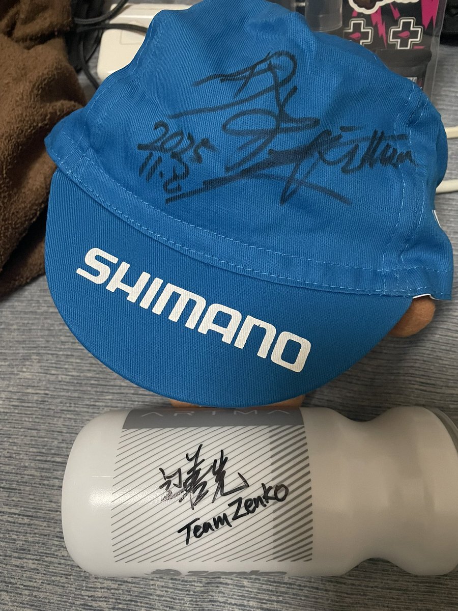 昨日AD藤本さんとZenkoさんからサインいただきました☺️ 大切に保管しないと。 サイン入りのシマノのキャップはBT21のSHOOKYに被ってもらっときましょ笑 #サイクルモード #岸和田競輪場 #ファンミーティング #AD藤本 #辻善光 pic.x.com/YtugFHeOui
