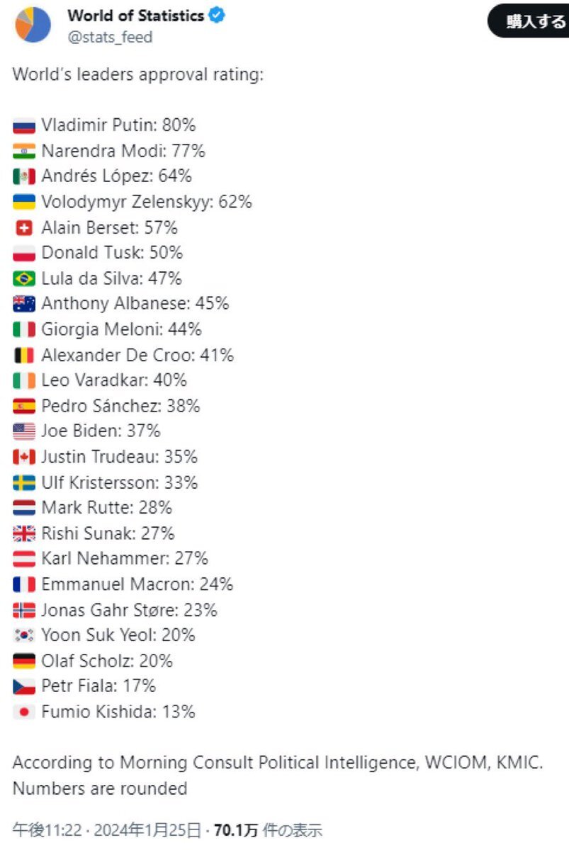 世界のリーダー支持率ランキングで我らが岸田が堂々の最下位!日本憲政史上最低の異名を欲しいまま。一刻も早く解散総選挙を施行せよ! #岸田文雄が総理大臣では国民は迷惑です pic.x.com/JBmfFCGXeF