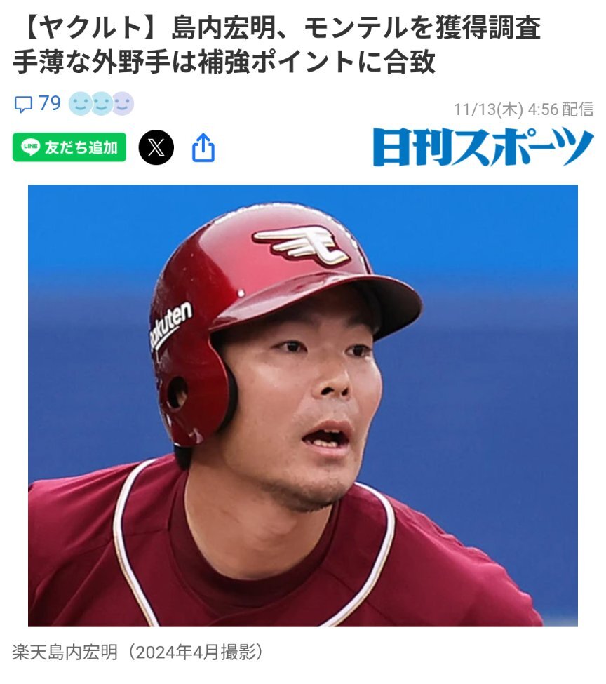 【ヤクルト】島内宏明、モンテルを獲得調査 手薄な外野手は補強ポイントに合致nikkansports.com/baseball/news/… ヤクルトが楽天を戦力外となった島内宏明外野手の獲得調査を行っている事が分かった。また西武を戦力外となったモンテル外野手の獲得調査をしている事も判明。育成契約での獲得を目指すとみられる
