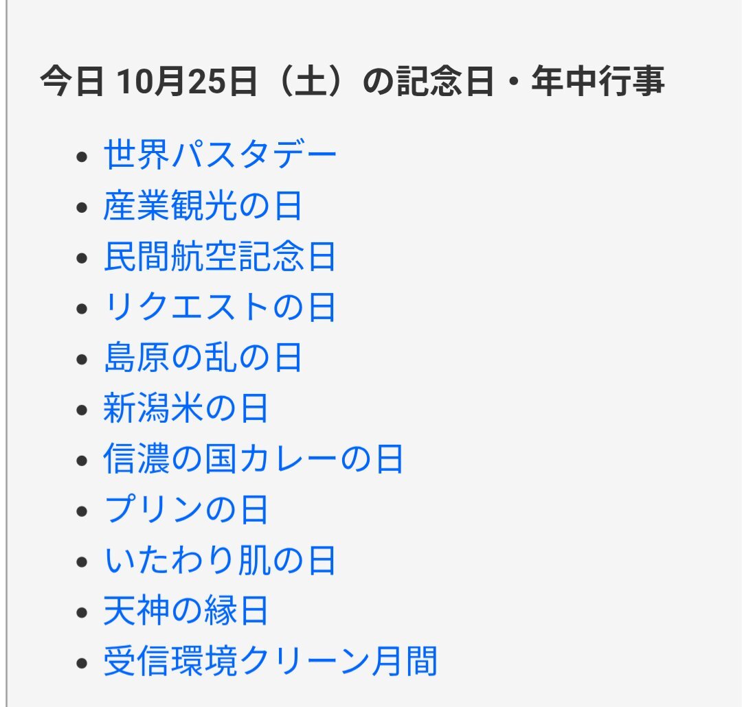 #今日は何の日 #世界パスタデー 絡めるソース濃厚 #産業観光の日 技術の高み猛攻 #民間航空記念日 空向かうジェット軌道 #リクエストの日 オーディエンス喜望 #島原の乱の日 起こすぜ革命狼煙 #新潟米の日 一粒の価値重い #信濃の国カレーの日 芸術的スパイス リスナー唸らすこのバース pic.x.com/jsI4QYP1QB
