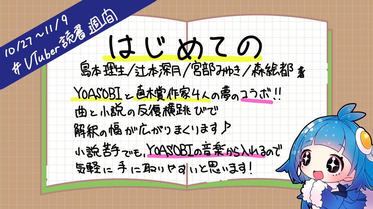 ╭━━━━━━━━━━━━━╮ 🍁!#VTuber読書週間!📷 ╰━━━━━━v━━━━━━╯ 10/27から読書週間ということで、オススメ本をご紹介! 島本理生/辻村深月/宮部みゆき/森絵都 『はじめての』(水鈴社) suirinsha.co.jp/books/detail5.… 曲と小説を往復で、一生味がするんですよね🦑