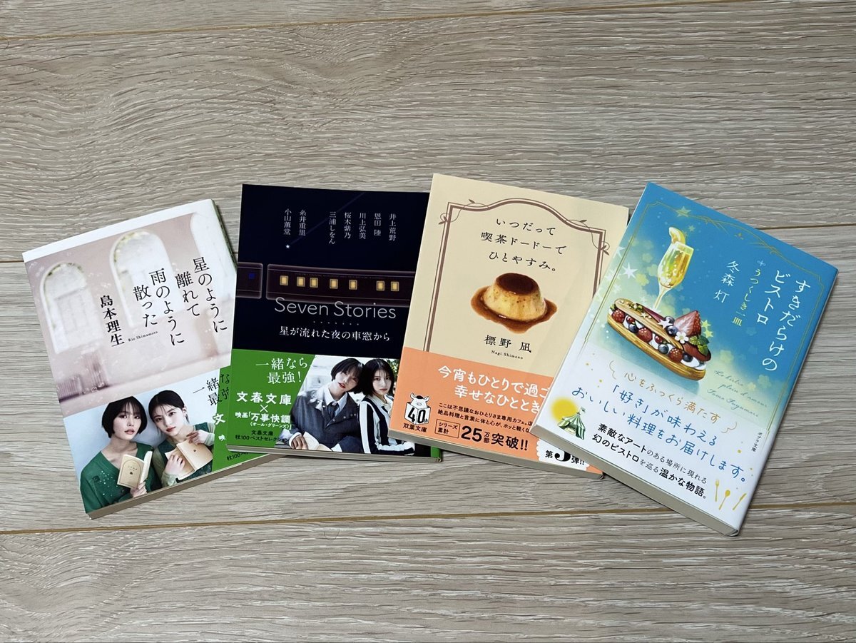 久しぶりに何冊か読みたい本があったので、購入。 『星のように離れて雨のように散った』 #島本理生 さん 『Seven Stories 星が流れた夜の車窓から』 井上荒野( @arereno )さん #恩田陸 さん #川上弘美 さん #桜木紫乃 さん #三浦しをん さん 糸井重里( @itoi_shigesato )さん #小山薫堂 さん pic.x.com/Dvmk78PpcD