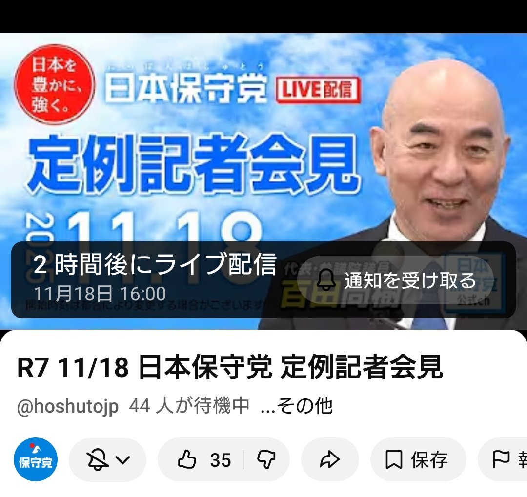 日本保守党公式チャンネル❗️ 11/18 火曜日 16:00〜 日本保守党定例記者会見を 配信致します。 今週も報告する案件多数かな❓️ 個人的には「あの」案件も言って 欲しいなぁ〜🙇✨ @hoshuto_jp #日本保守党 #百田尚樹代表 #島田洋一衆議院議員 #有本香事務総長 youtube.com/live/8v6acx3DL… pic.x.com/FHacNV911v