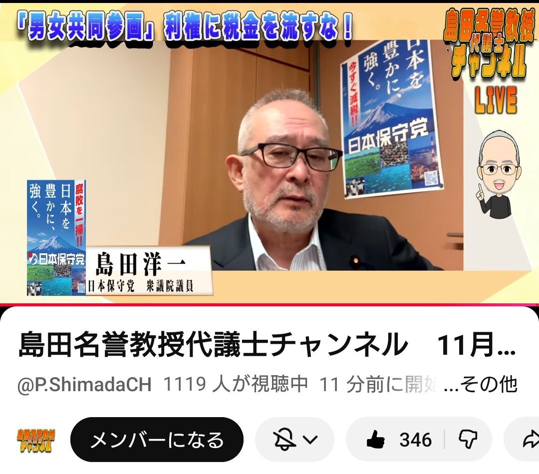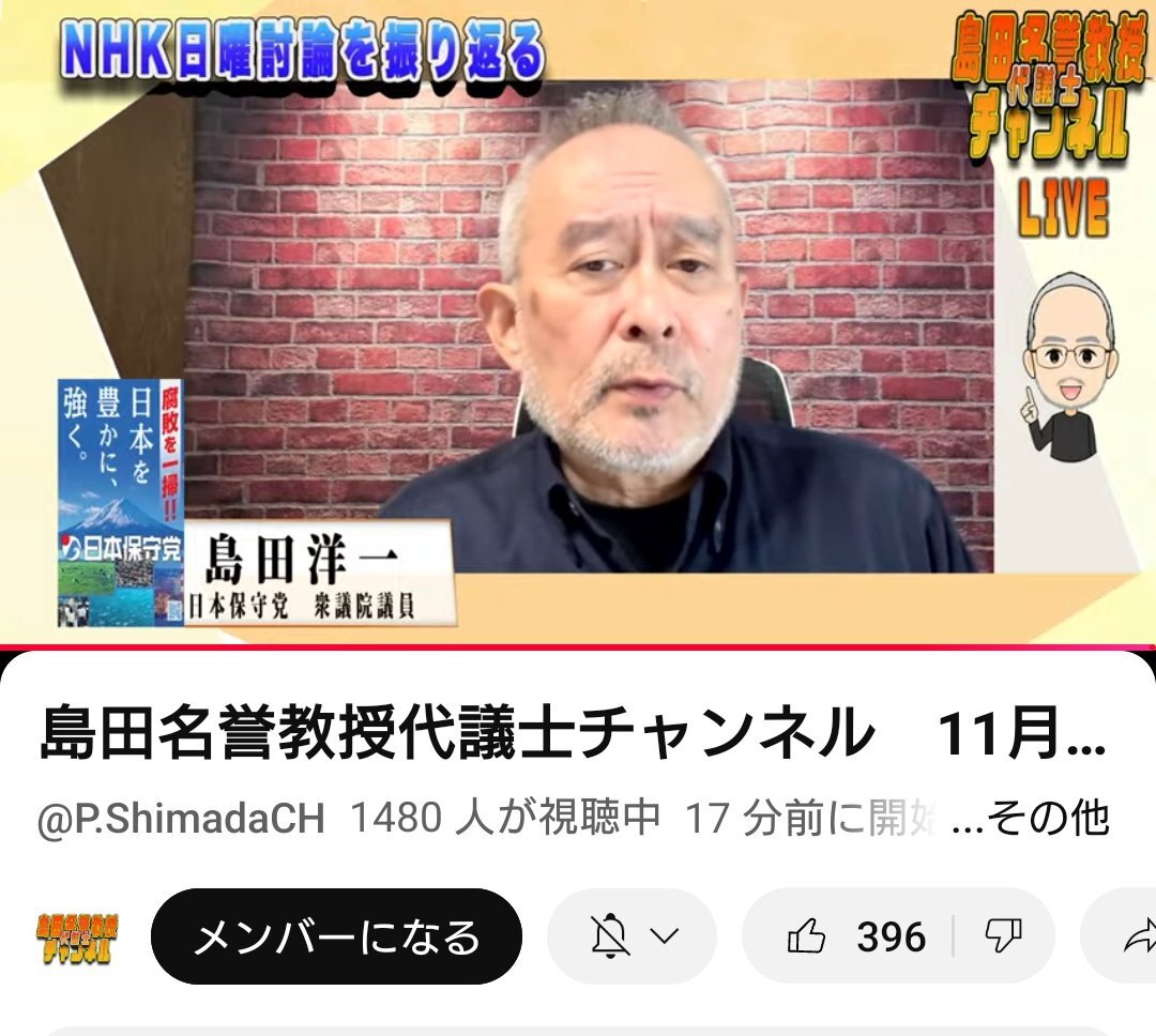 島田名誉教授代議士チャンネル❗️ 只今ライブ配信中〜‼️😀✊ @ProfShimada #日本保守党 #日本を豊かに強く #島田洋一衆議院議員 youtube.com/live/xNv9gnJsn… pic.x.com/uAoONcJ5Cs