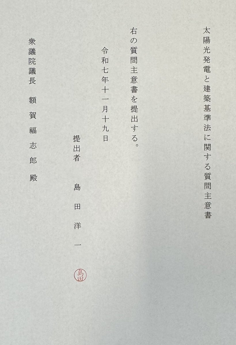 💙太陽光発電と建築基準法に関する質問主意書 提出❗️ #島田洋一衆議院議員 #日本保守党 x.com/ProfShimada/st…