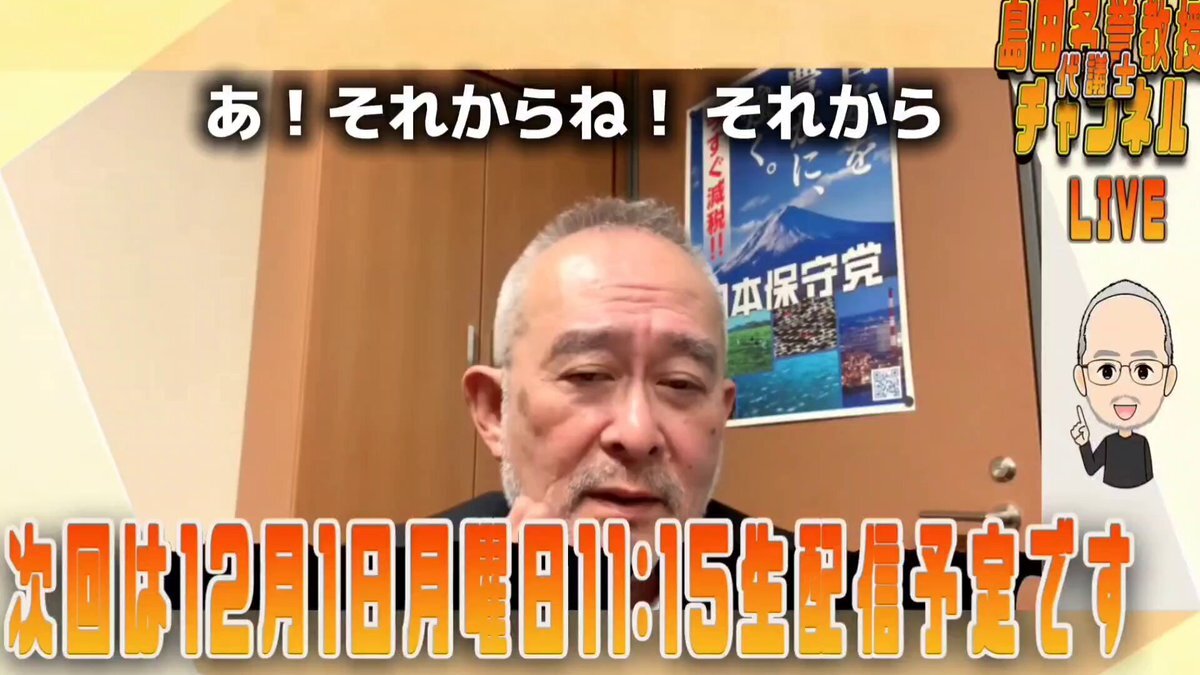今週11月30日‼️ 日曜討論‼️ 再び島田先生出演‼️ (ᐠ ᐛ )ᐟイイイイイヤャアァァッッタァァァァァァァァァ‼️ 《テーマ2本立て》 ①高市政権・対中国言動への評価 ②本日提出の補正予算案をどう見るか 島田名誉教授代議士チャンネルより ホヤホヤの情報🥳 リンク⬇⬇⬇ youtube.com/live/hvGWNRKwM…