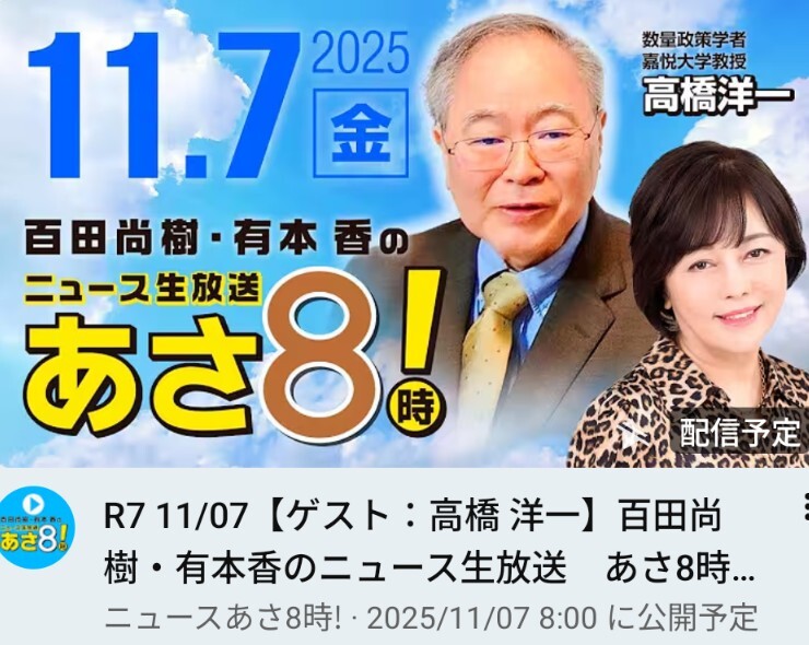 おはようございます。 2025.11.7 ニュース生放送 #あさ8 ジャーナリスト 有本香とお届けする本日のゲストは数量政策学者の 高橋洋一さんです。 #あさ8 オープン予定は8時、8時です。 毎朝7:30頃お届けの非公式連絡網は ちびまめこです。 よろしくお願いします。 【#あさ8】↓ x.com/Hanamameko1006…
