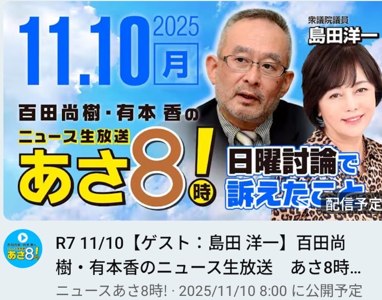 おはようございます。 2025.11.10 ニュース生放送 #あさ8 ジャーナリスト 有本香と 本日ご一緒するのは #日本保守党 衆議員議員 #島田洋一議員 『日曜討論で訴えた事』です。 #あさ8 オープン予定は8時、8時です。 毎日7時30分頃お届けの非公式連絡網は ちびまめこです。 pic.x.com/KO5HcyOR7Z x.com/Hanamameko1006…