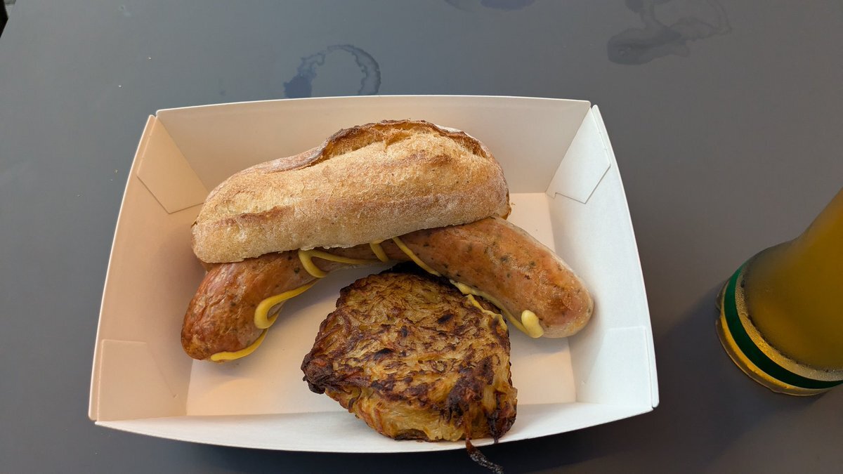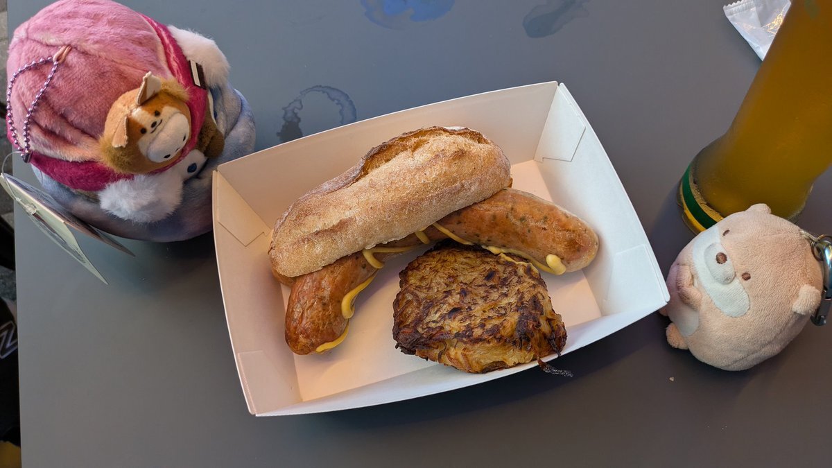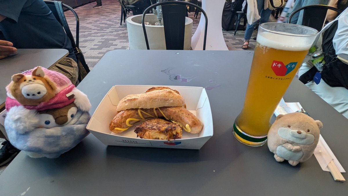 ということで夕食はルクセンブルク館の飯屋ででけぇホットドッグとビール ソーセージが食べ応えあると聞いてたが想像以上にデカい、そしてビールはこの歳で初めて飲んだ(マジ)がこれはかなりうまうまだった #嵐を呼ぶ文月紀行 pic.x.com/iKCf5KpnwH