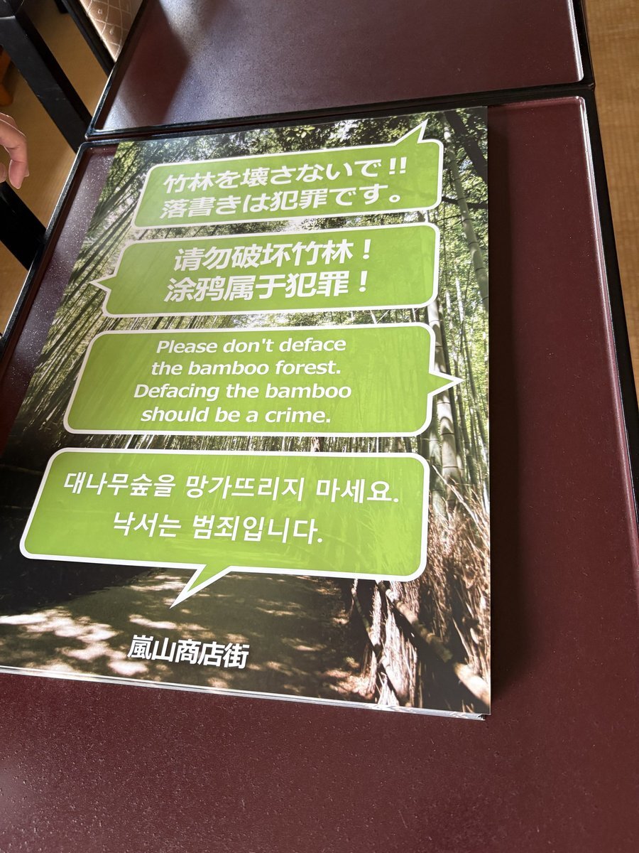 多言語表記の竹林の竹への落書きしないでポスター。嵐山商店街の各店頭に貼ります。 #竹林 #落書き #啓蒙 #嵐山商店街 pic.x.com/Ar2QYq452m