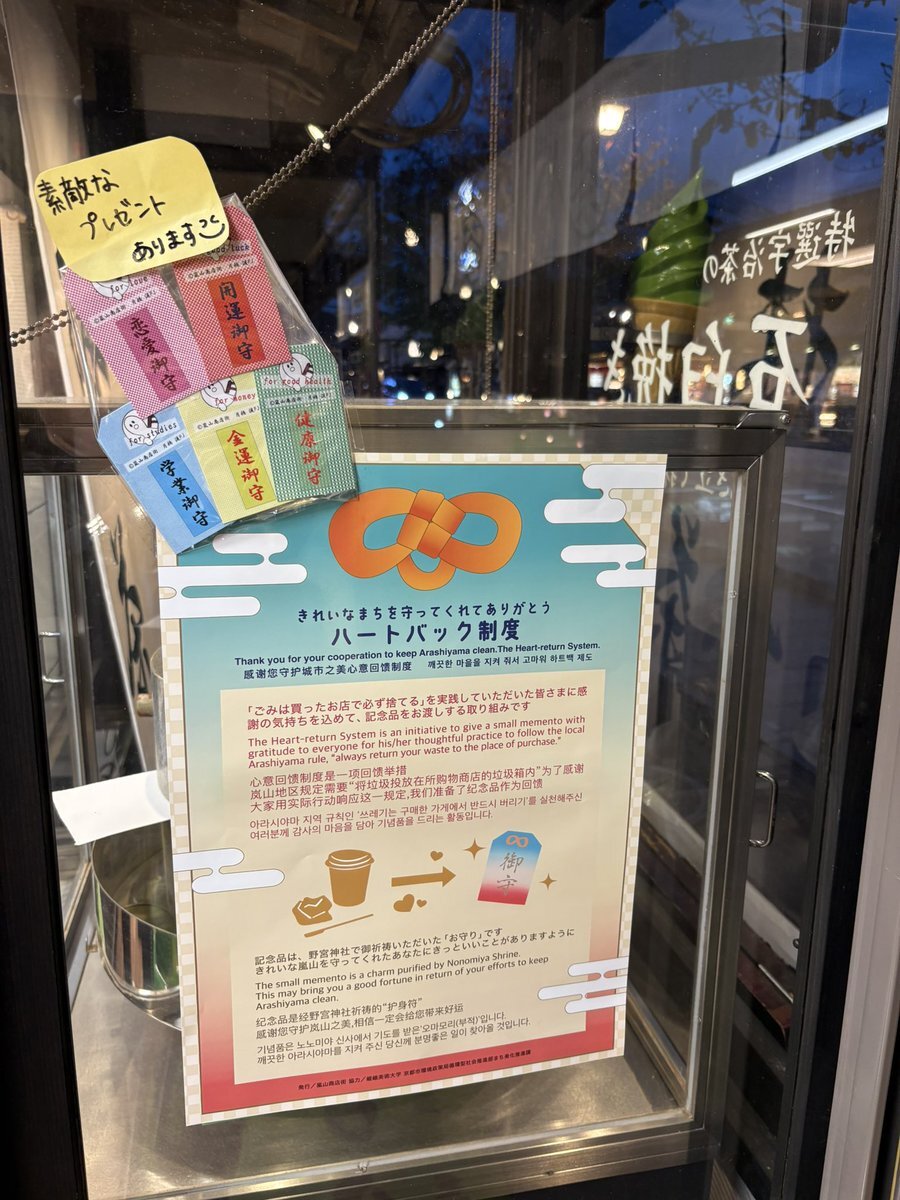 嵐山ゴミ減量作戦!します 「ごみは買ったお店で必ず捨てる」を実践して食べ終わった容器を返すと、野宮神社でご祈祷いただいた手作りのお守りをお渡しする取り組み。ポスターは嵯峨美大生が作成。 #嵐山商店街 #京都市まち美化推進課 #嵯峨美術大学 #野宮神社 #観光課題 pic.x.com/ac1b3Nwcvy