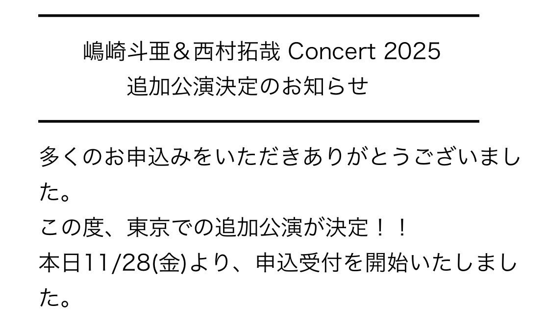嶋崎斗亜&西村拓哉 Concert 2025追加公演🎤🎪 ◎公演日 1/6(火)18:00 1/7(水) 11:00、14:30、18:00 申込:12/1(月)11:59迄 当落:12/15(月)以降 ➡️12/8(月)とあたく会当落🌟 12/15(月)とあたくコン当落🌟 !!!!!2週連続当落!!!!! #嶋崎斗亜 #西村拓哉 pic.x.com/eNiU9XB0zh