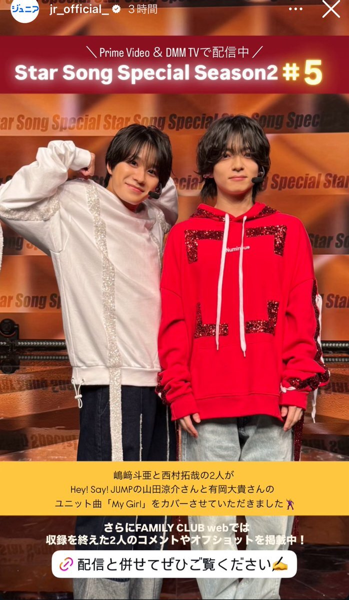 / 🎉本日『Star Song Special シーズン2』第5回配信🎉 \ 関西ジュニアの嶋﨑斗亜と西村拓哉が 山田涼介&有岡大貴のユニット曲 「My Girl」をカバー。 さらにKing & Princeの「HEART」もジュニアと共に披露‼︎ みんなのカッコよさにハートがドキドキ♡ They make my heart flutter… #スタソン
