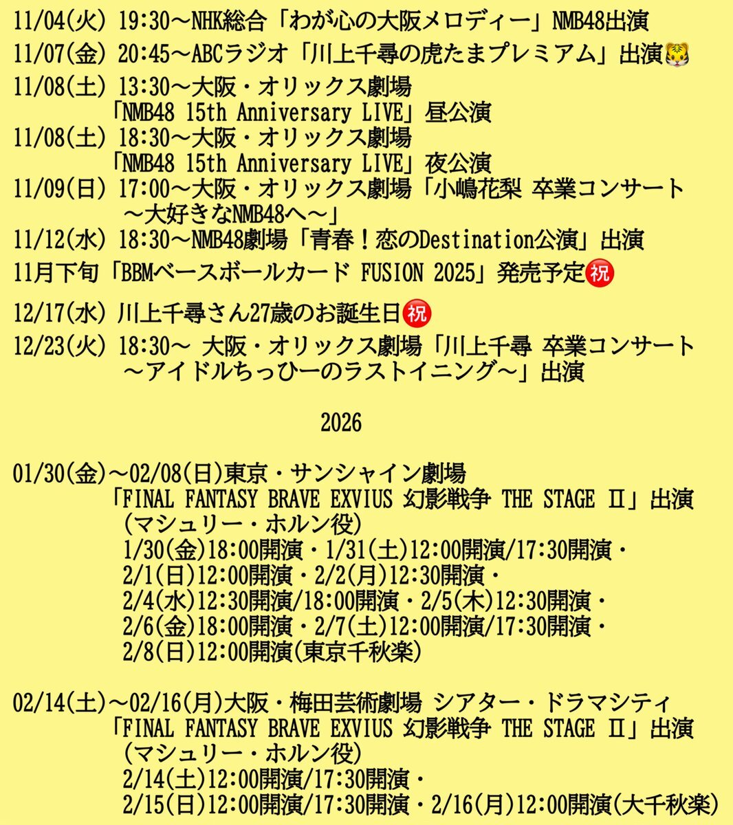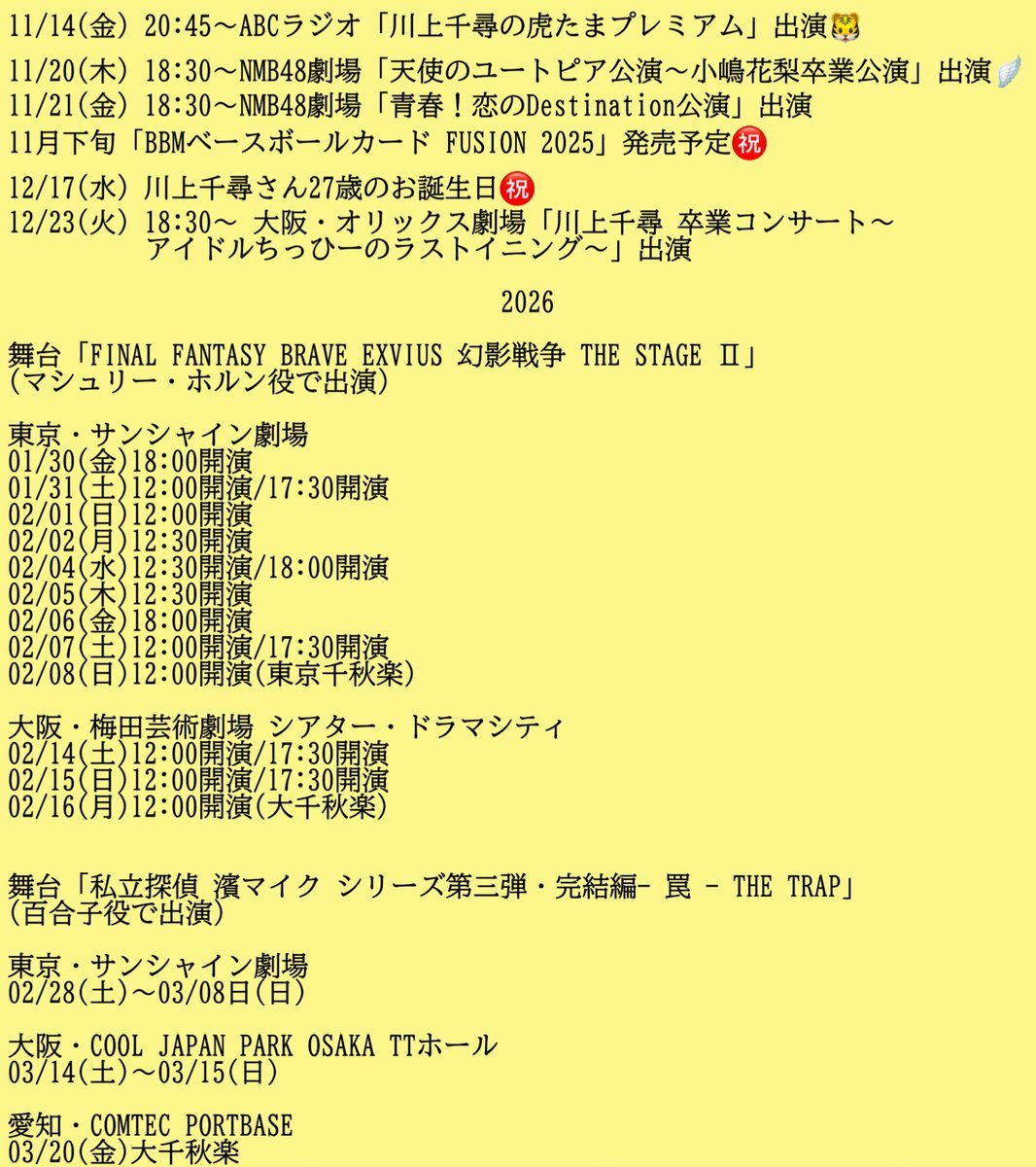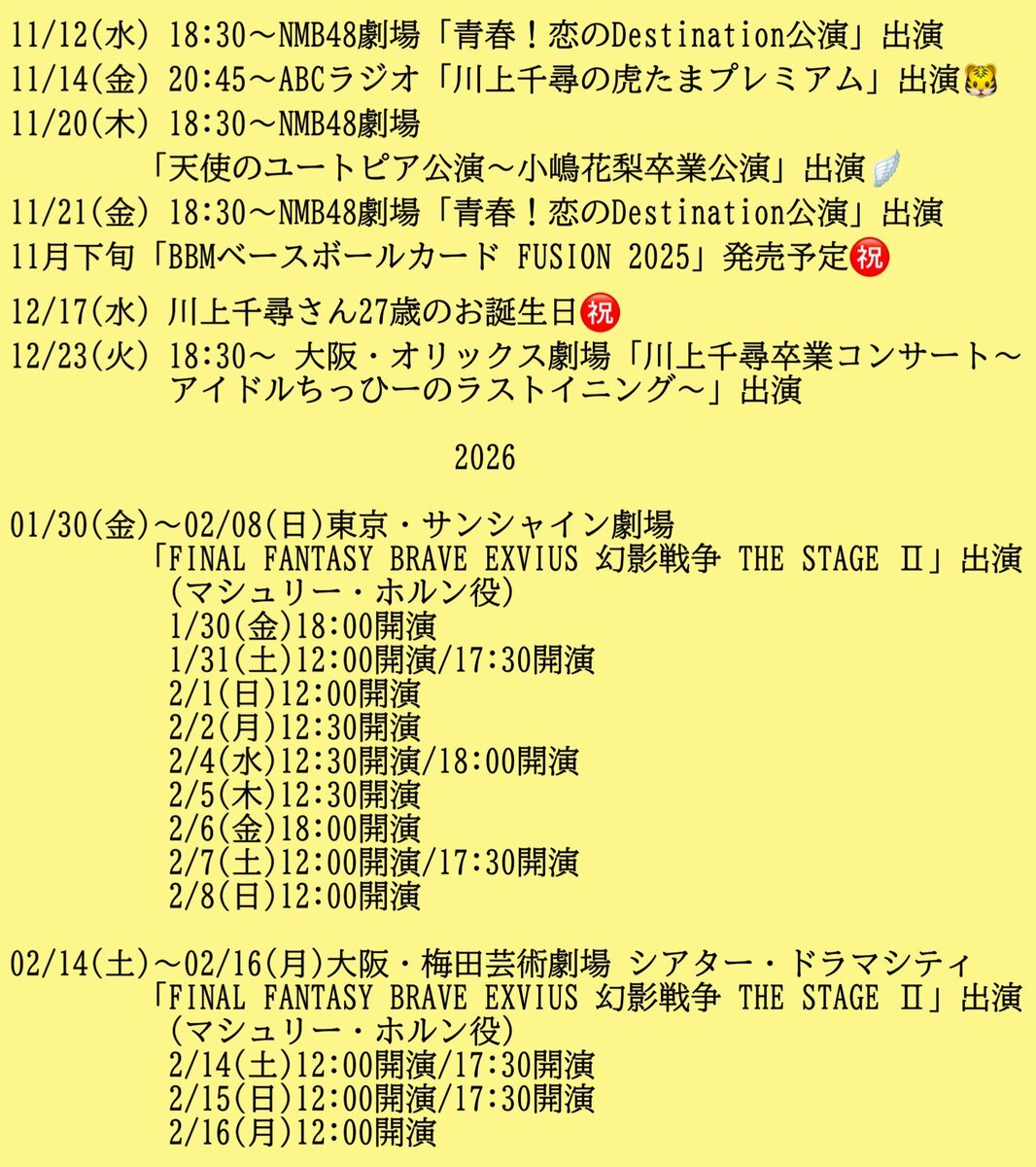 #ちっひー のすけじゅーる帳💛 #川上千尋1st写真集 #永遠未遂 発売中🩷 12/17 川上千尋さん27歳の誕生日㊗️ 12/23 川上千尋さん卒業コンサート 〜アイドルちっひーのラストイニング #Joshin CMキャラクター #月刊タイガース #ちっひー虎の虫🐯 #川上千尋の虎たまプレミアム🐯 #NMB48 11/13更新 pic.x.com/X6ynk9KQ8q