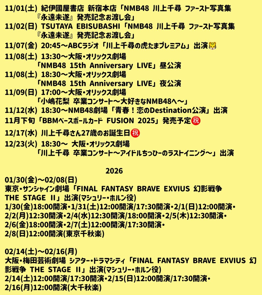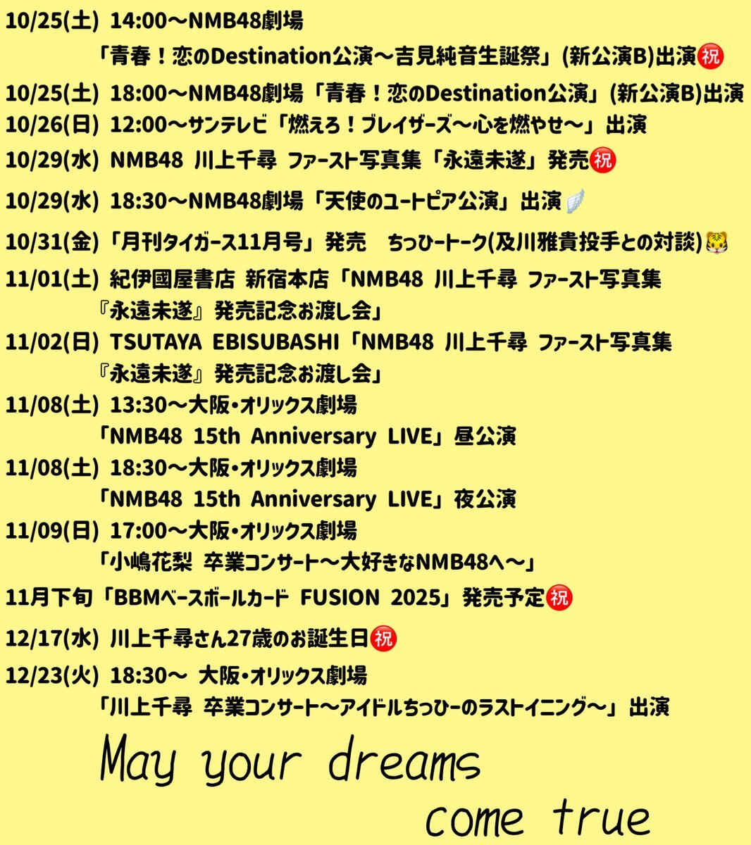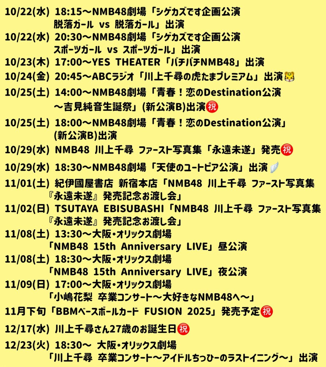#ちっひー のすけじゅーる帳💛 #川上千尋1st写真集 #永遠未遂 発売中🩷 12/17 川上千尋さん27歳の誕生日㊗️ 12/23 川上千尋さん卒業コンサート 〜アイドルちっひーのラストイニング #Joshin CMキャラクター #月刊タイガース #ちっひー虎の虫🐯 #川上千尋の虎たまプレミアム🐯 #NMB48 11/4更新 pic.x.com/2RNZMyt93f