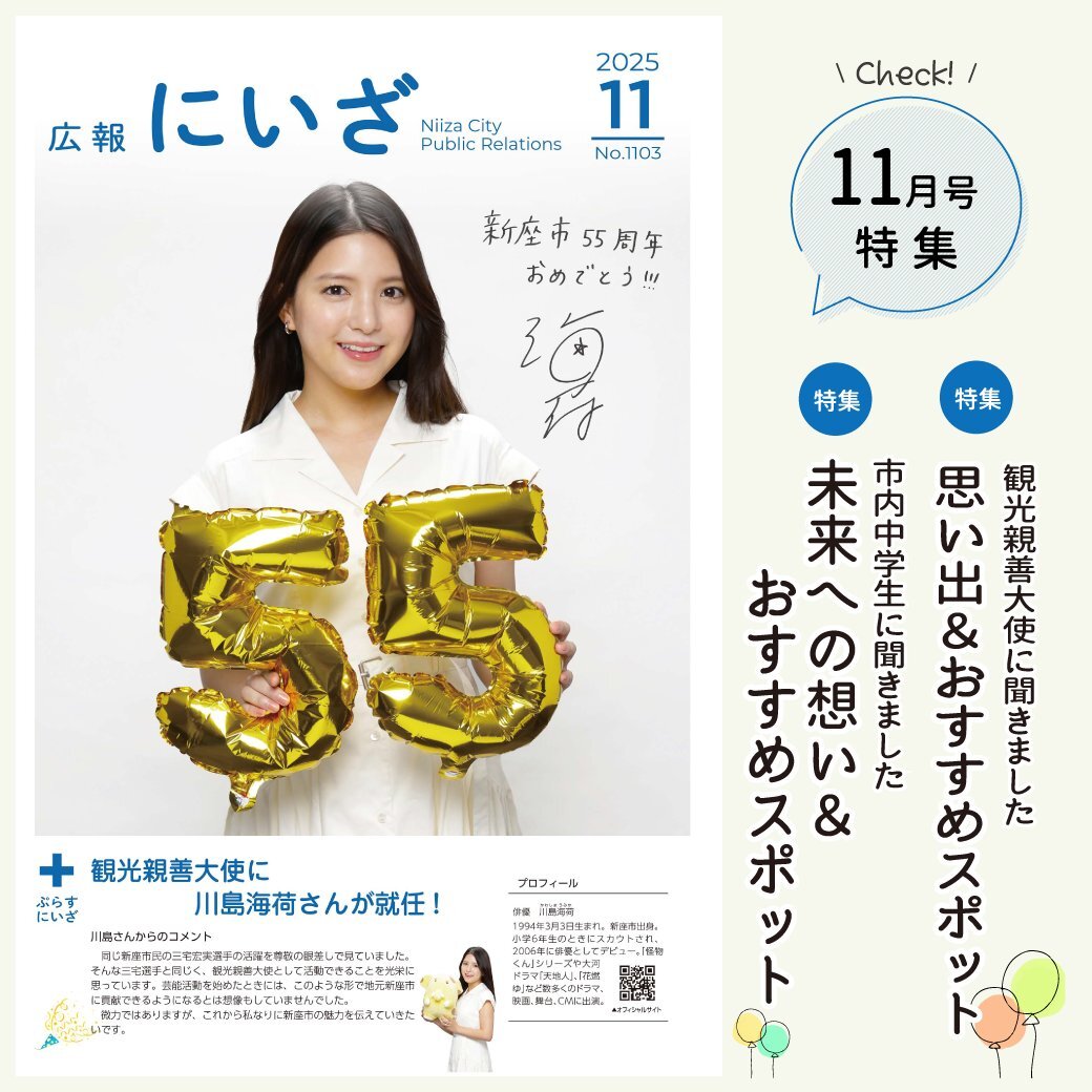 / 広報にいざ11月号を発行しました! \ 特集は「観光親善大使の思い出&おすすめスポット」、「市内中学生の未来への想い&おすすめスポット」です! ほかにも市の情報が満載です!ぜひご覧ください! 詳しくは⇒ city.niiza.lg.jp/site/r7-kouhou… #新座市 #広報 #55周年