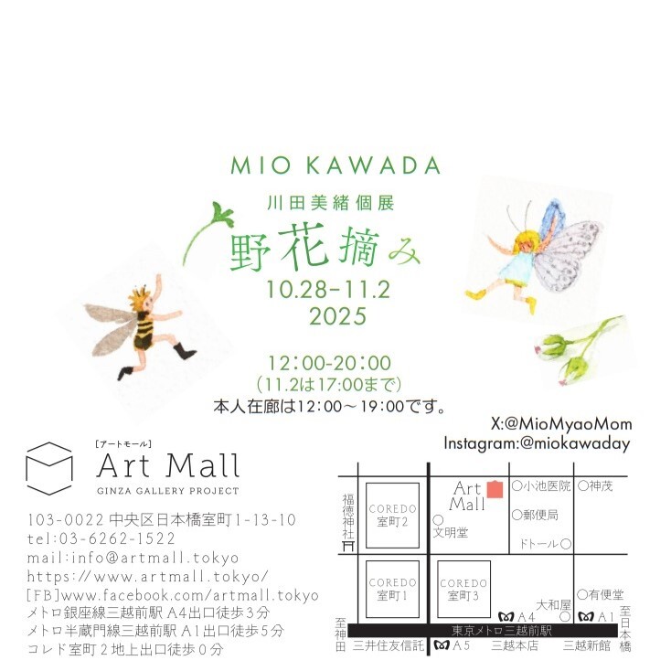 11月2日の Art Mall オープンしました🌥️ 大好評の川田美緒展「野花摘み」も最終日です🦋 午後5時で閉幕となりますので🕔お早めにお立ち寄りください💁 #日本橋 #三越前 #アートモール #artmall #アートショップ #artshop #アート購入 #川田美緒 #MioKawada #水彩画 #野花摘み #植物画 #花の絵 pic.x.com/n8FTMpPMd4
