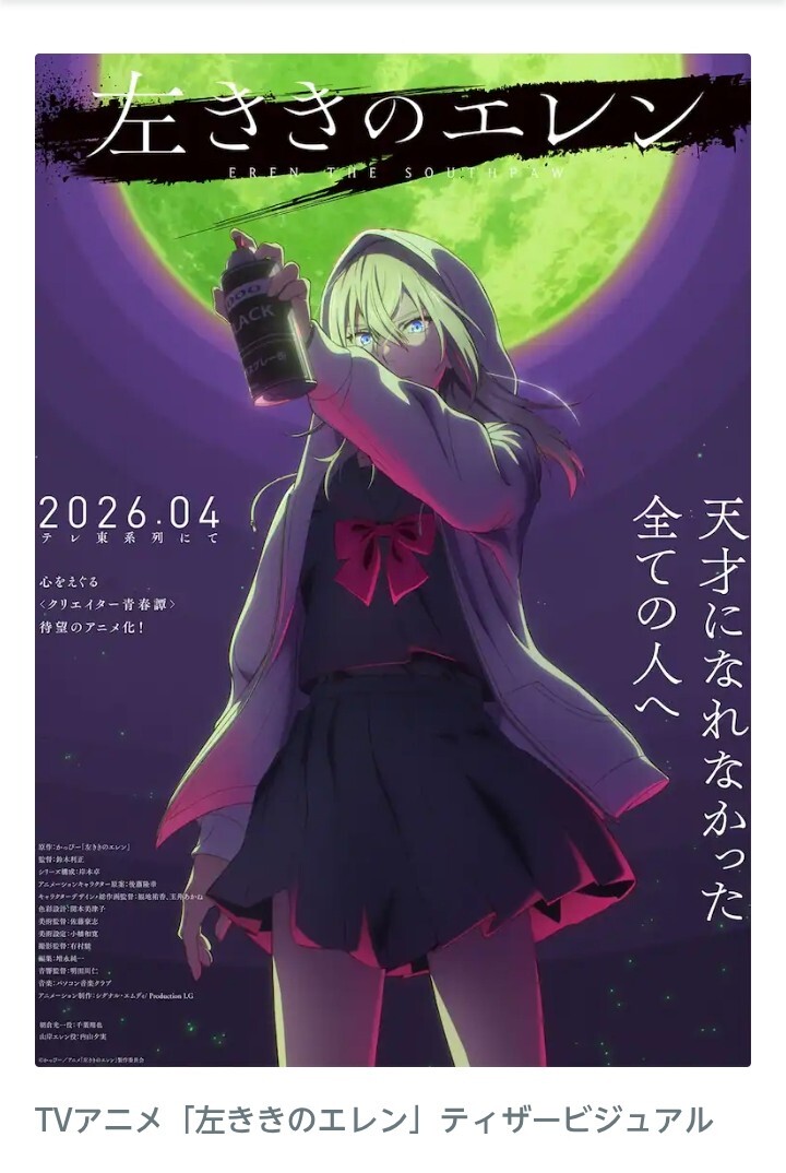 TVアニメ「左ききのエレン」が2026年4月からテレ東系列にて放送決定! ビジュアル&PV公開  manga.watch.impress.co.jp/docs/news/2062… #左ききのエレン pic.x.com/ZTKdGY9Ajd