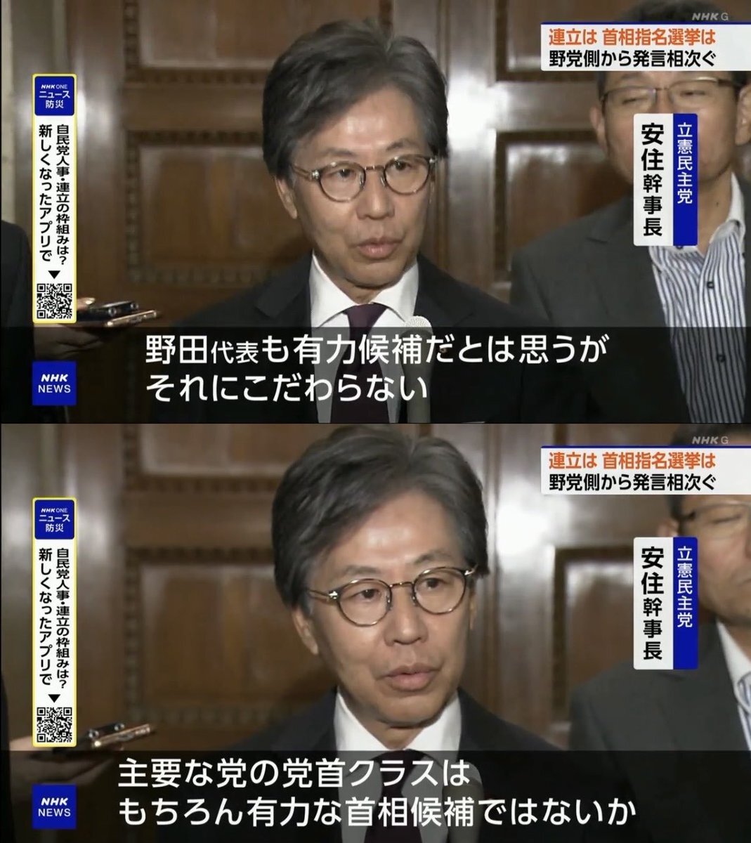 【総理候補、野田佳彦にこだわらない】総理大臣指名選挙をめぐり、立憲民主党の安住淳は日本維新の会に対し『野党で統一候補をつくり一致した対応を取りたい』と呼びかけ。 安住淳「野田代表も有力候補だとは思うがそれにこだわらない。党首クラスはもちろん有力な総理大臣候補」