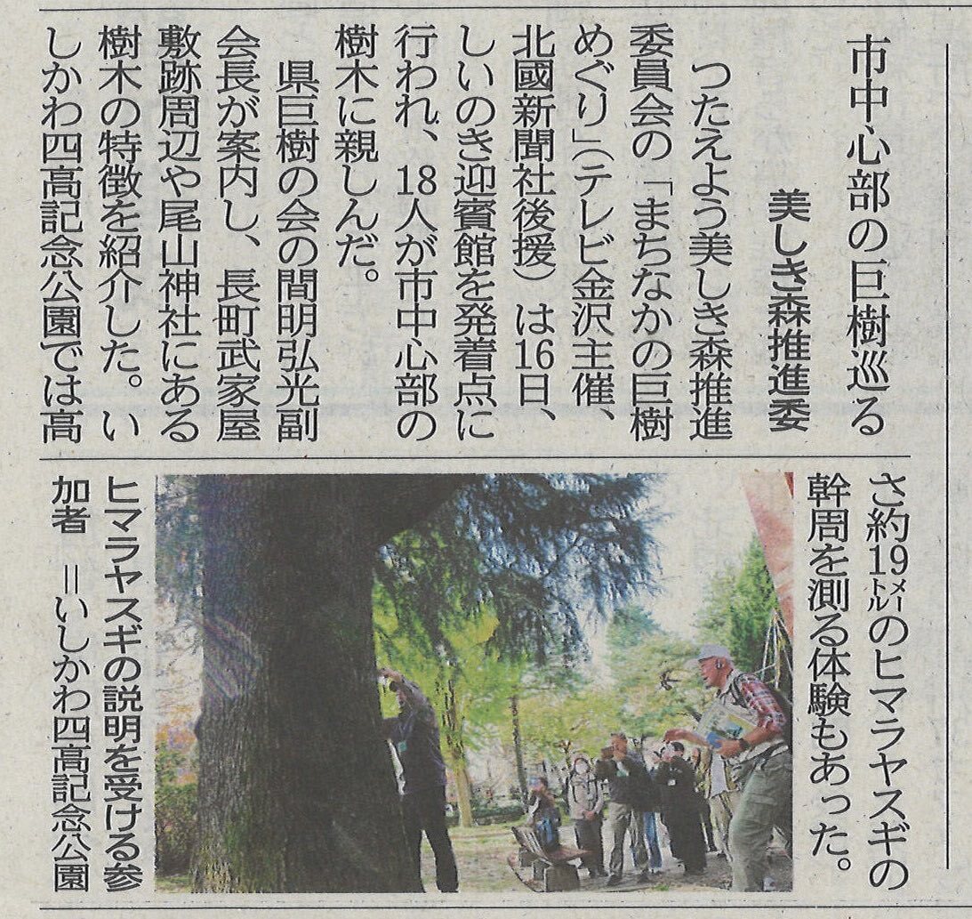 今日の北國新聞朝刊より。 昨日の「まちなかの巨樹めぐり」の記事が載りました。 ご協力いただいた皆様、ありがとうございました。 石川県巨樹の会では、このような取り組みをこれからも続けてまいります。 #テレビ金沢 #まちなかの巨樹めぐり #北國新聞朝刊 #巨樹 pic.x.com/P1omyQV35J