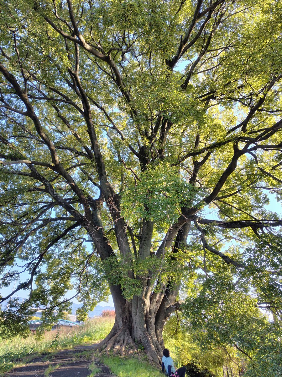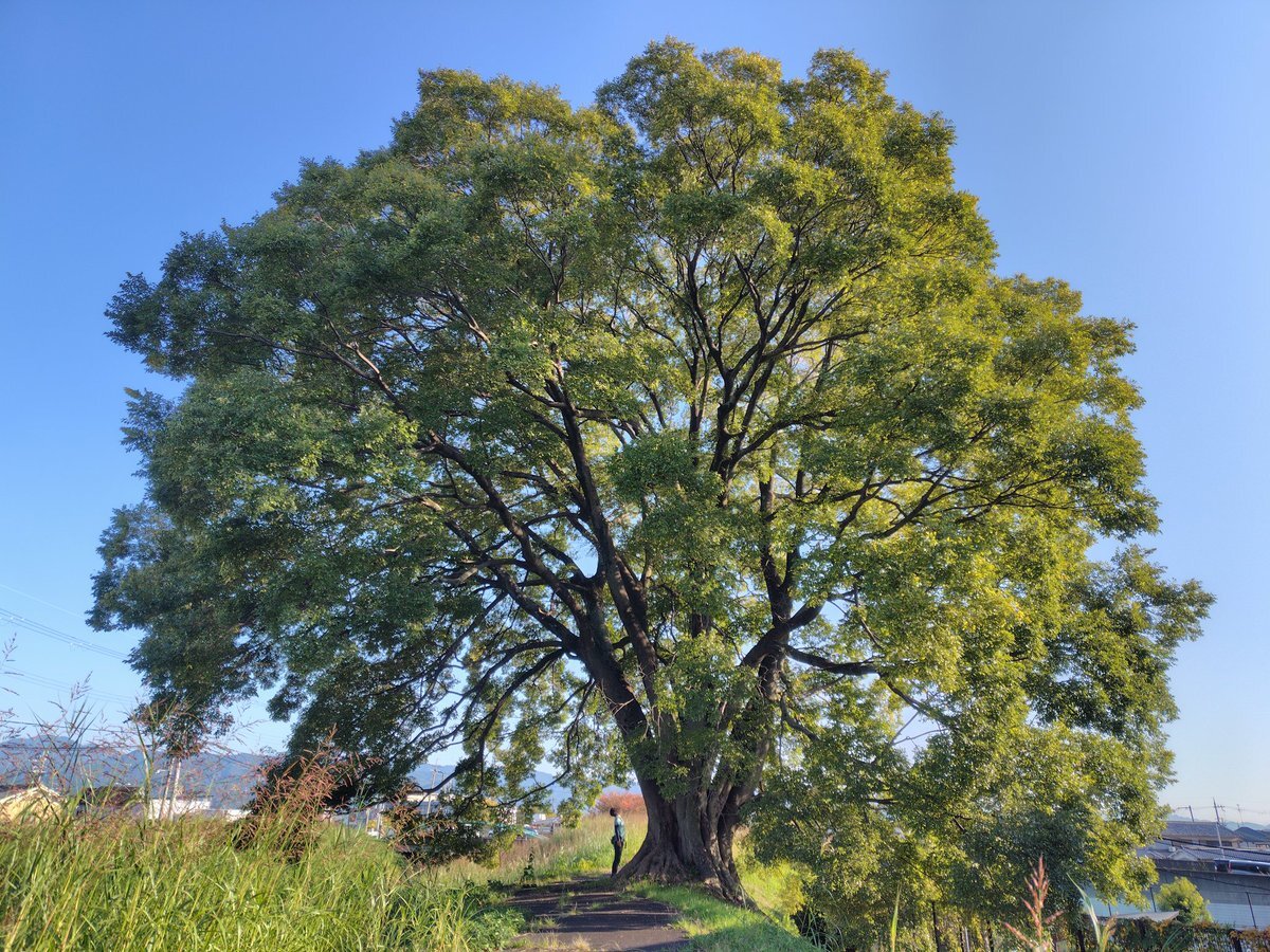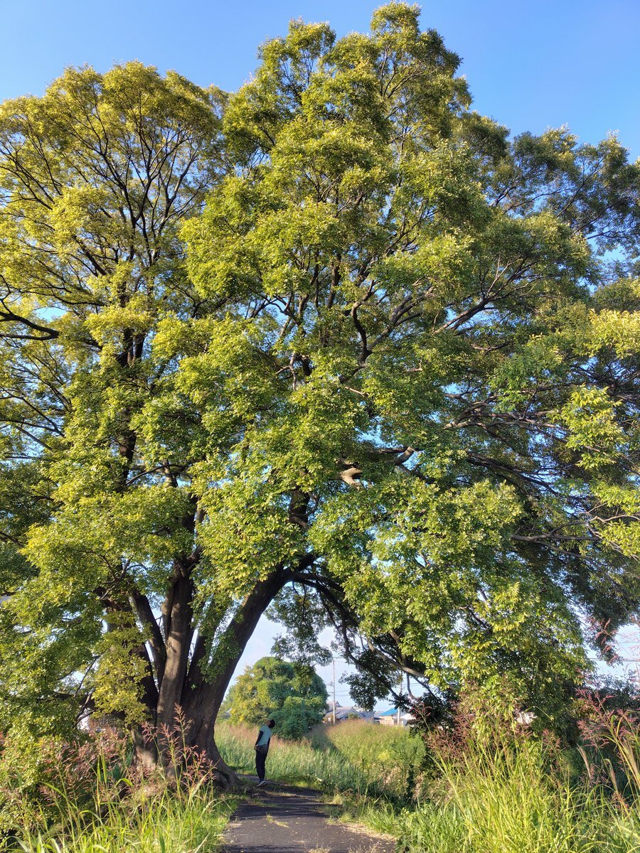 飛鳥川堤のエノキ 幹周り:5.71m、樹高:22m 堤防上にあり、隣接するのは水道局とあって剪定されず樹冠を広げている。下流約1kmにある「蘇武橋のエノキ」はランドマークとなっているが、このエノキは人の目にとまることも少なくひっそり枝葉を繁らせている maps.app.goo.gl/RBCfryBwfEujSs… #巨樹 #奈良県橿原市 pic.x.com/FXrcz3fZib